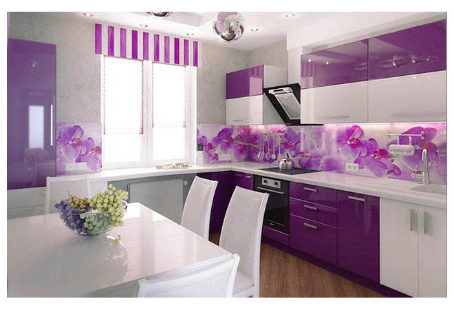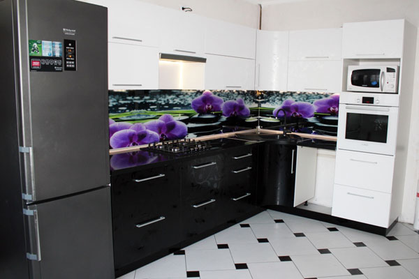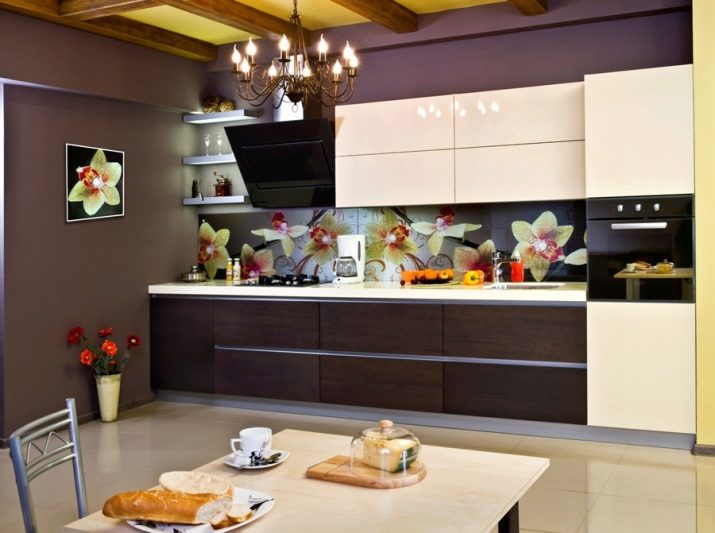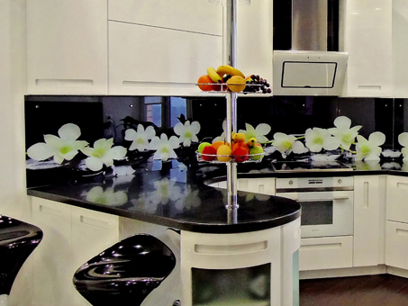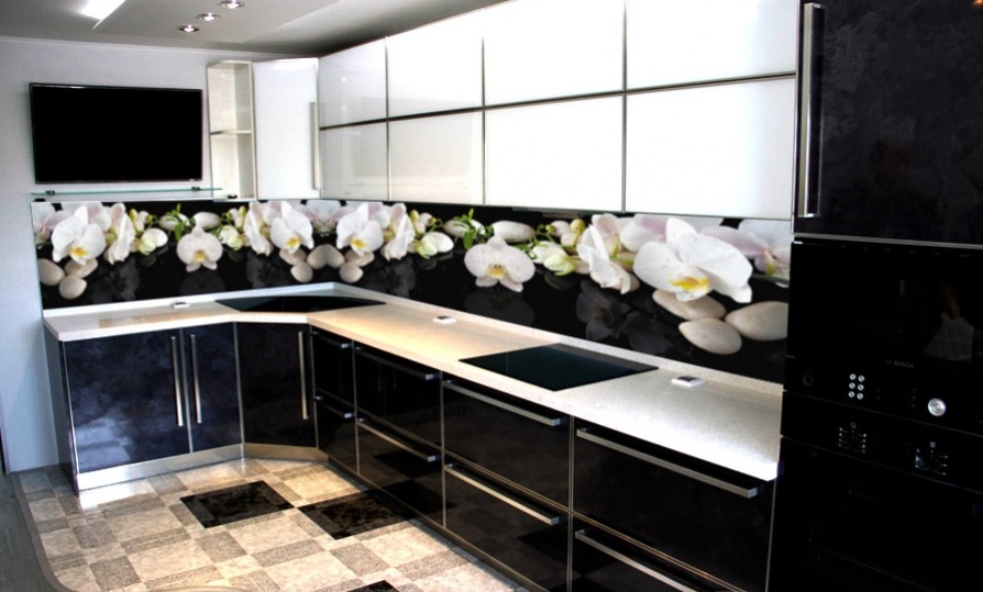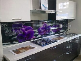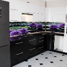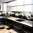 Wenn Sie eine Schürze für die Küche Orchidee mit einem schwarzen Hintergrund wählen, dann wird Ihre Küche dramatischer, aber zur gleichen Zeit, sehr spektakulär. Solch ein Paneel kann die Größe der Küche visuell reduzieren, wird aber Tiefe und Geheimnis geben. Große schwarze oder dunkelviolette Blüten erzeugen einen ähnlichen Effekt.