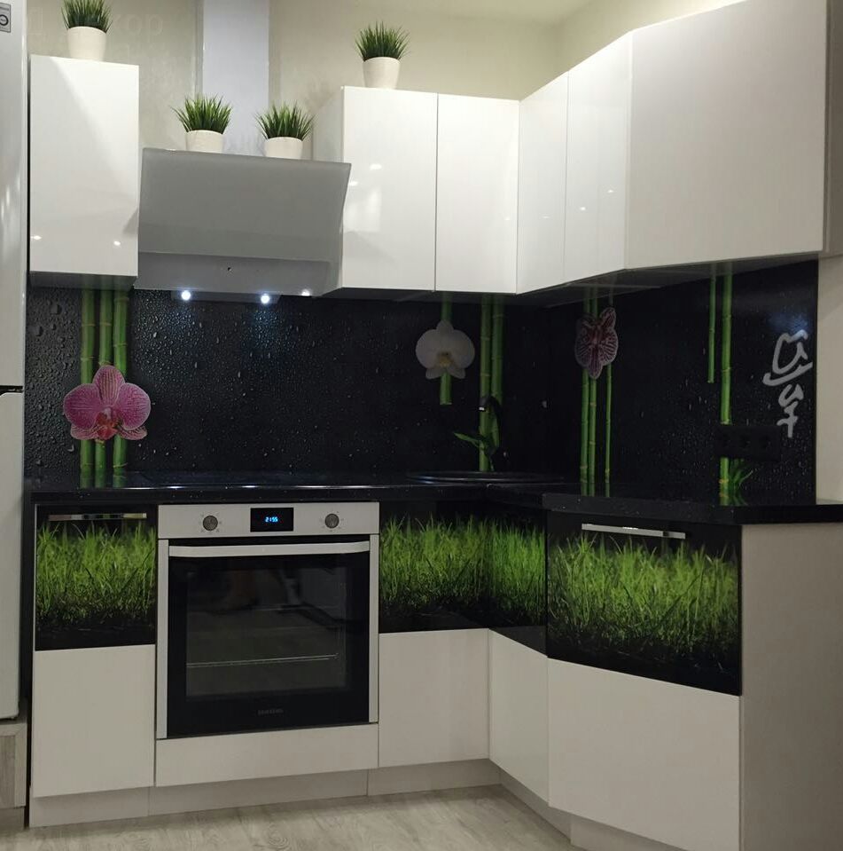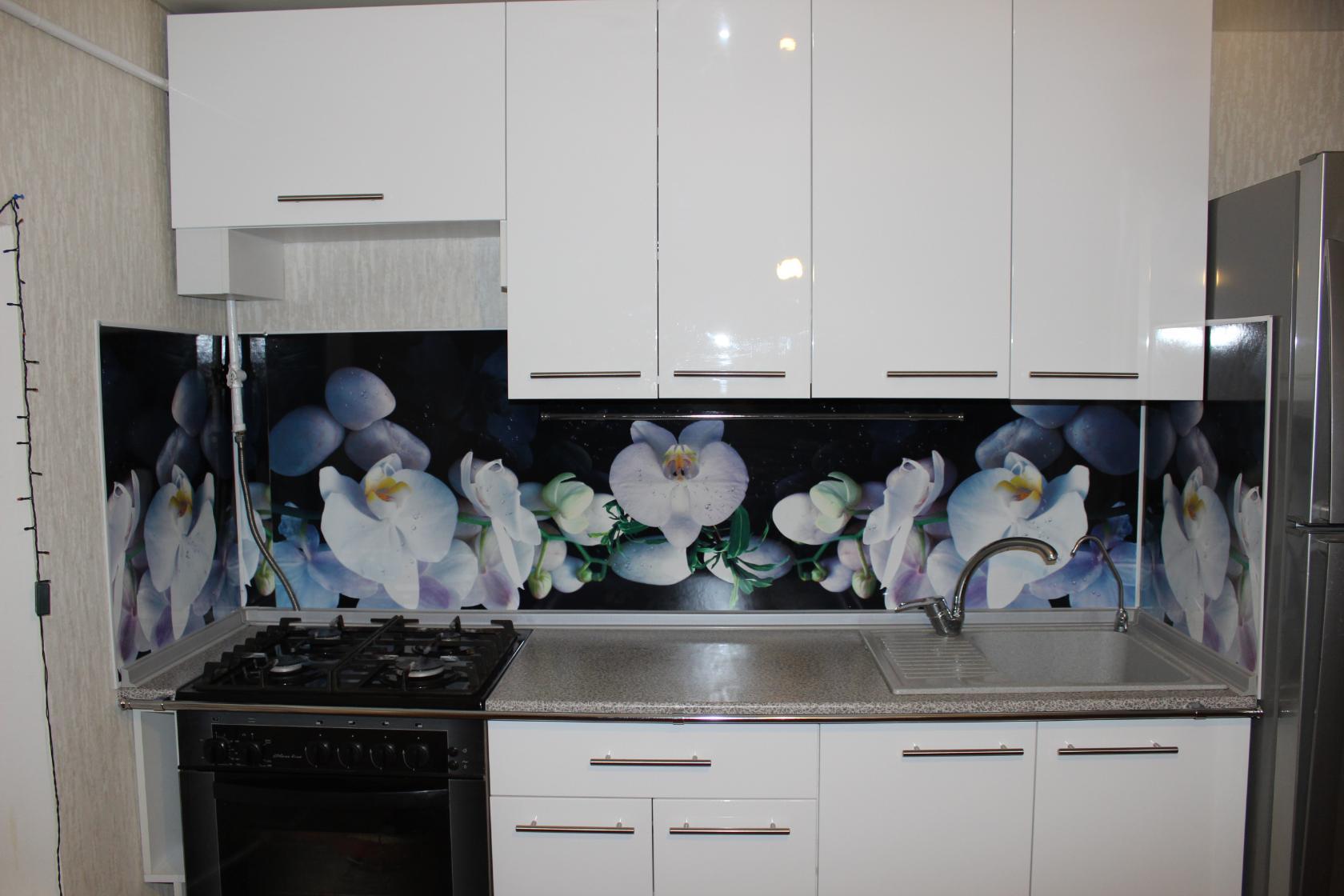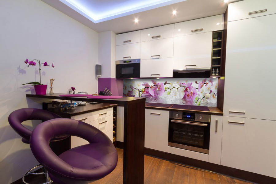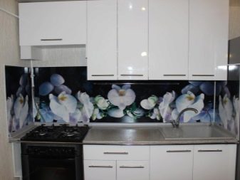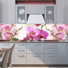 Helle Wandpaneele mit Orchideen-Fotodruck machen den Küchenraum leichter und luftiger. Am beliebtesten ist die Kombination aus weißem Hintergrund und großen Blüten aus hellen Orchideen. Dieses Design wird ideal für kleine Küchen sein. Die brillante Lichtfläche reflektiert das Licht perfekt und vergrößert den Raum.