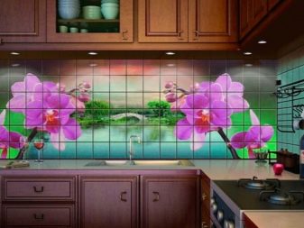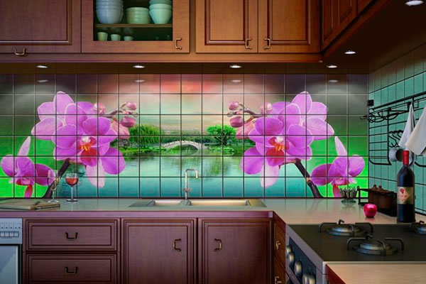 - Keramikfliesen. Schürze für Küche Orchideen können aus Fliesen verschiedener Größe ausgelegt werden. Große Fliesen eignen sich für große Räume und kleine für kleine. Gleichzeitig können die Blüten der Orchidee selbst aus mehreren Fliesen zusammengesetzt oder auf einer gelegt werden. Eine gekachelte Schürze erweist sich kostenmäßig als teurer als Wandpaneele, sieht aber äußerlich spektakulär aus und ist widerstandsfähiger gegen Temperaturextreme.