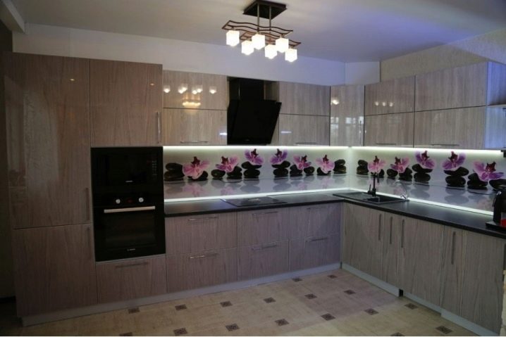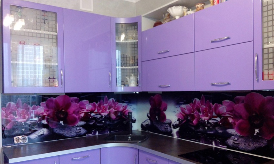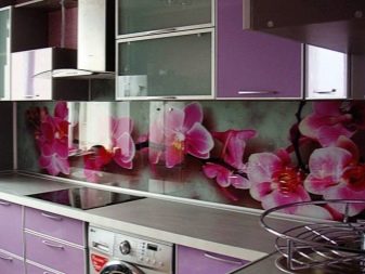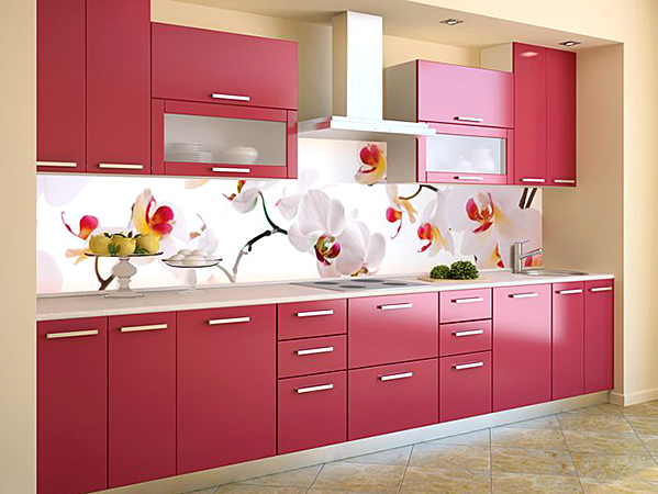 Die Schürze für die Küche mit einer Orchidee passt perfekt in den Innenraum und macht es elegant und raffiniert. Es ist erwähnenswert, dass die tropische Orchidee an sich eine sehr zarte und mysteriöse Blume ist, die sowohl in Töpfen auf unseren Fensterbänken als auch in Einrichtungsgegenständen gut aussieht. Es wird angenommen, dass Orchideen zu luxuriös für einen rustikalen Stil sind, aber für die Dekoration der Küche im Stil von Art Deco oder dezentem Minimalismus sind sie genau richtig.