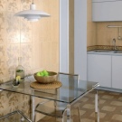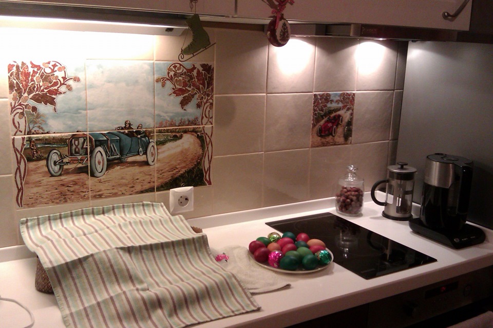 - für kleine Räume empfiehlt es sich, die Wände mit kleinen Keramiken zu dekorieren, da großformatige Produkte an der Wand einer Miniküche ein Gefühl der Enge erzeugen