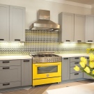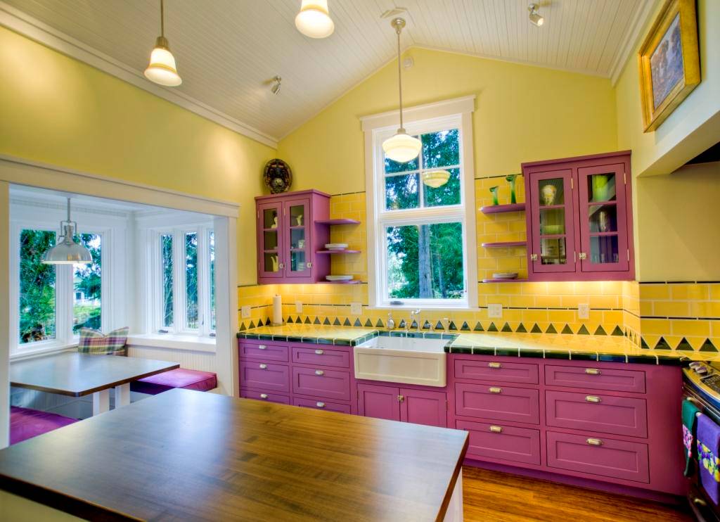 Orange, hellgelb, olivgrün und grün eignen sich für die lila Küche.
