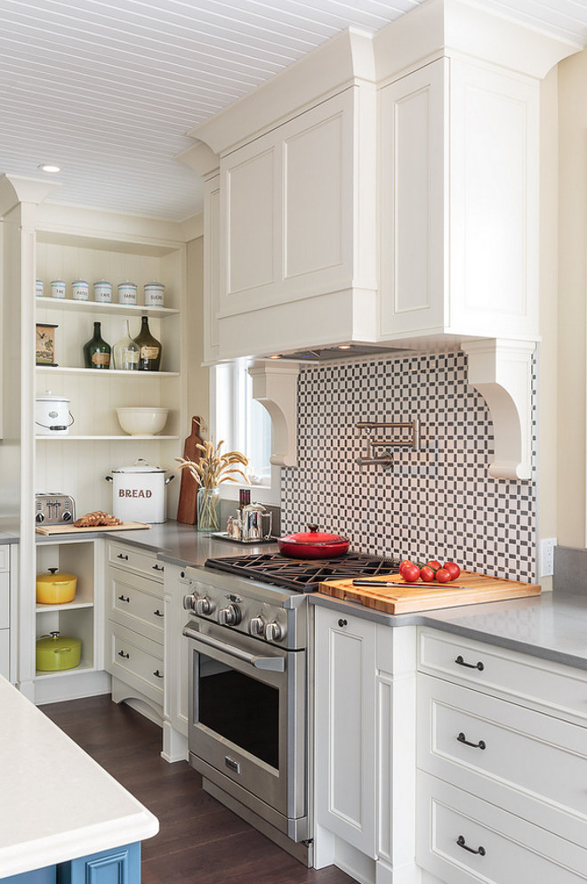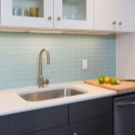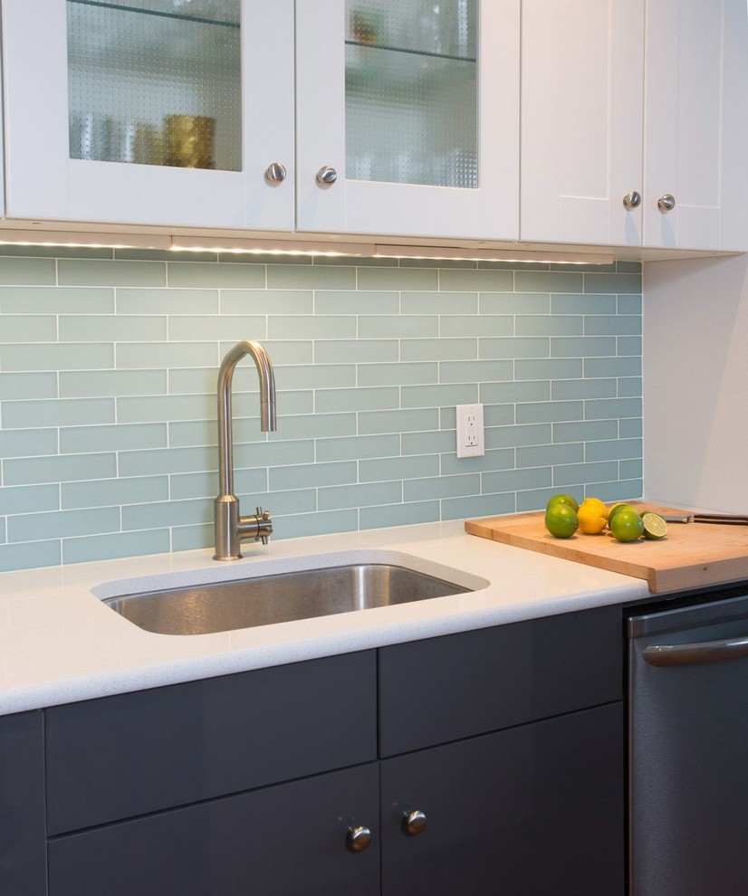 Möbel in Blau oder Blau ergänzen die graue, milchige, beige oder sogar weiße Wandschürze.