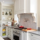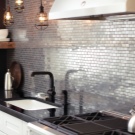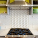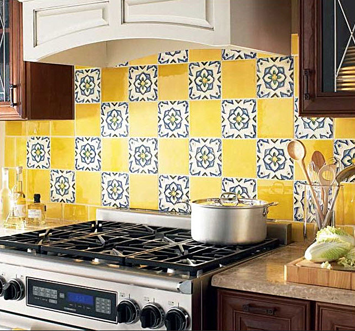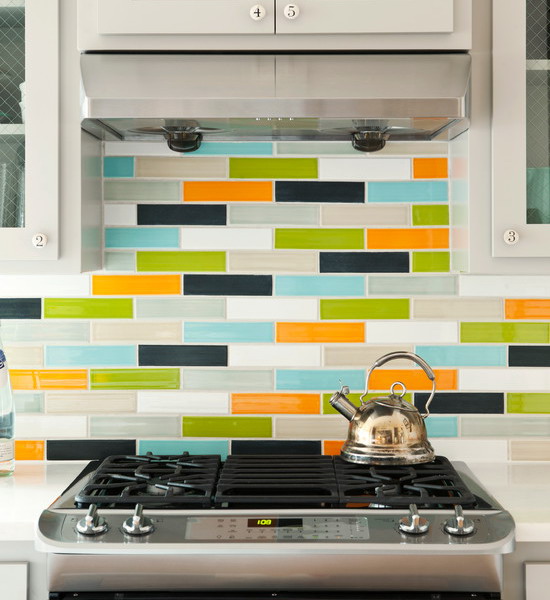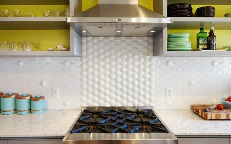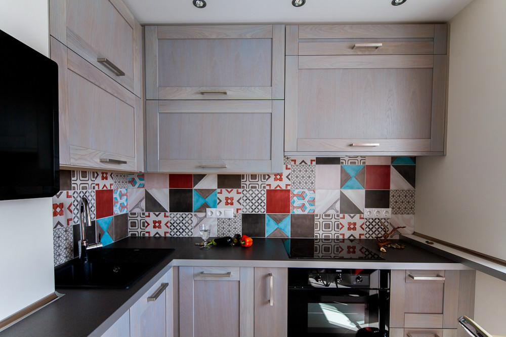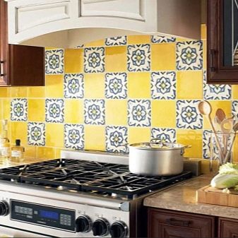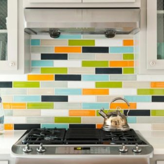 Die monochrome und die Verwendung der gleichen Farbe für die Wandplatte des Küchensets kann nicht als eine rationale Lösung bezeichnet werden. Weitere interessante und gewinnbringende Optionen sind eine Kombination aus verschiedenen Schattierungen oder sogar Farben sowie die Verwendung der Texturmethode. Zum Beispiel werden Keramikfliesen von unregelmäßiger Form original aussehen - dreieckig, sechseckig, in Form von Rauten usw. Um diese Art von Design optisch ansprechender zu machen, können Sie die Lücke mit farbigem Fugenmaterial füllen oder dekorative Schrauben an den Fugen der Fliesen verwenden.