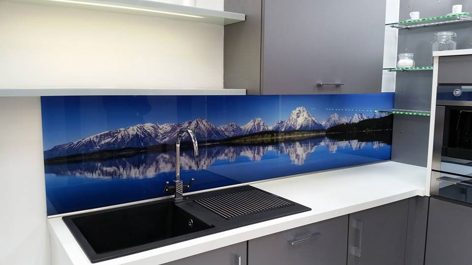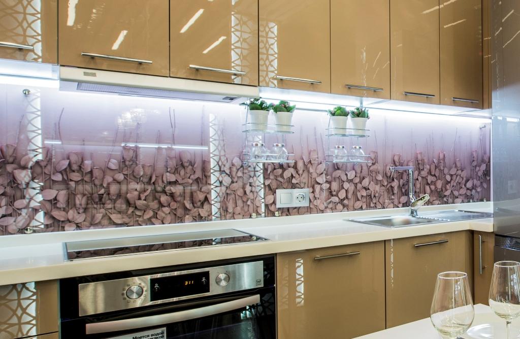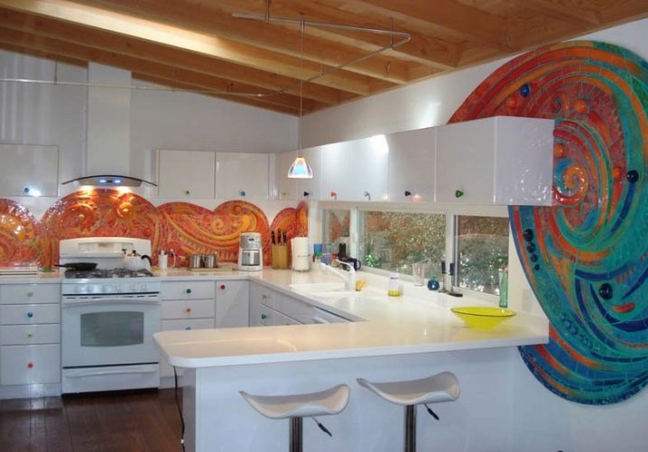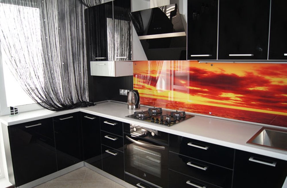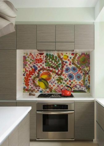 Heute sind Wandpaneele mit Fotodruck, 3D-Zeichnung, hellem und saftigem Design gefragt. Damit die Küche im Gegensatz zur bunten und ungewöhnlichen Schürze nicht zu bunt und lächerlich wirkt, müssen Sie für die Fronten des Küchensets ruhige oder neutrale Farbtöne wählen.