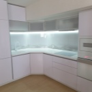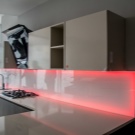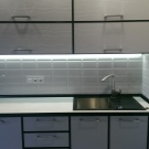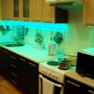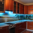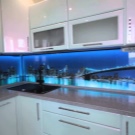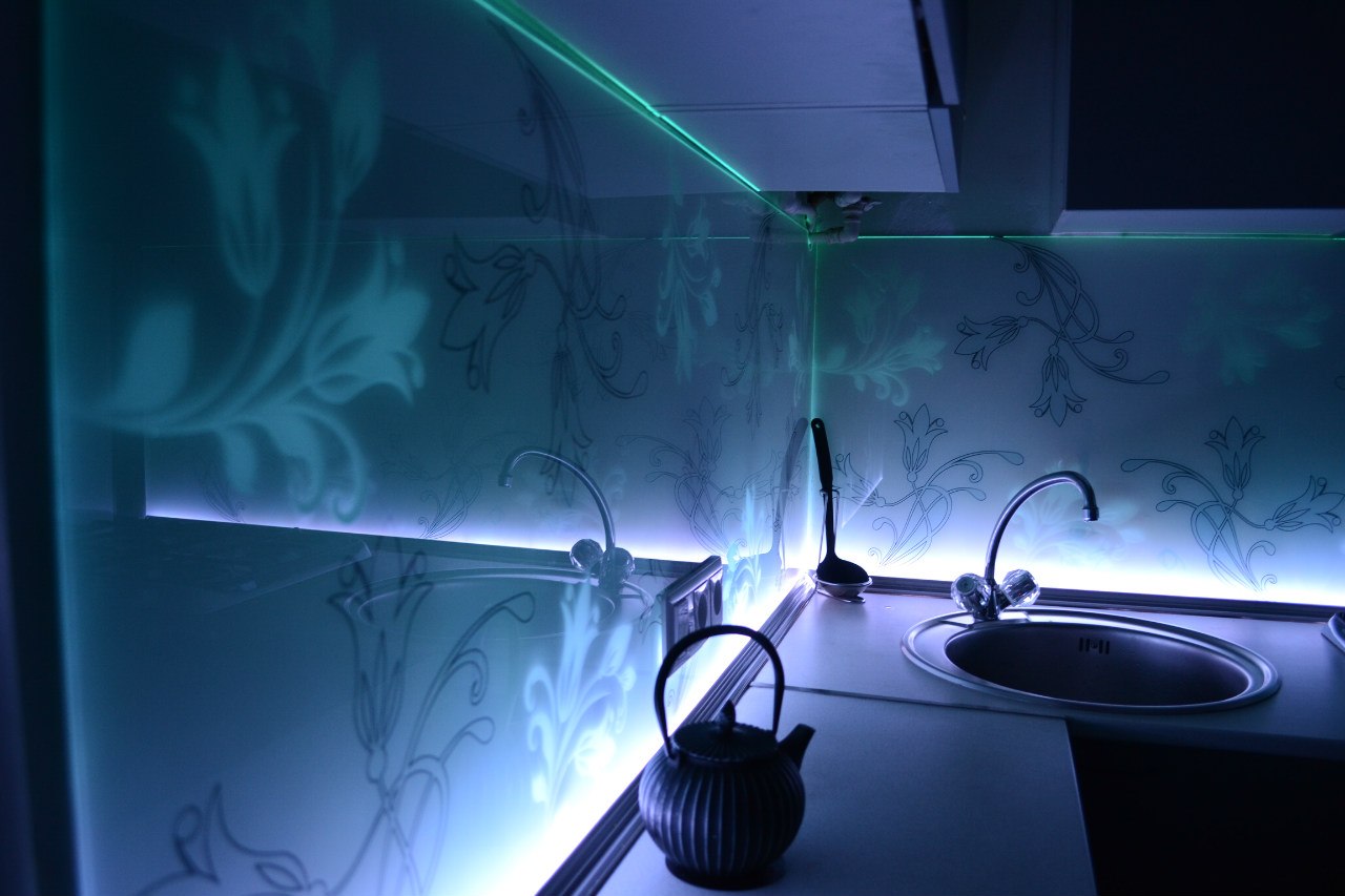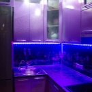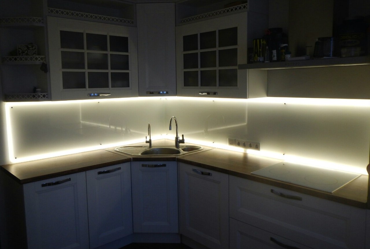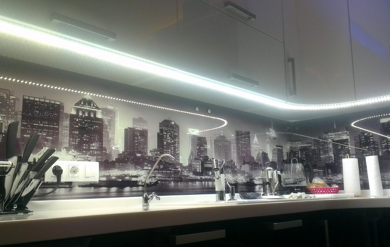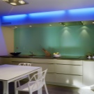 In den meisten Fällen ist das LED-Band auf einer speziellen Klebeschicht unter den Wandschränken angebracht und streut Licht von der Arbeitsplatte bis zur Küchenschürze. Unglaublich stilvoll, sieht es in Kombination mit glänzender Verkleidung oder Glaspaneelen aus. Eine nicht triviale Lösung wäre die Verwendung von Glühbirnen mit Glas-Triplex. In diesem Fall befindet sich das Band zwischen den Glasschichten.