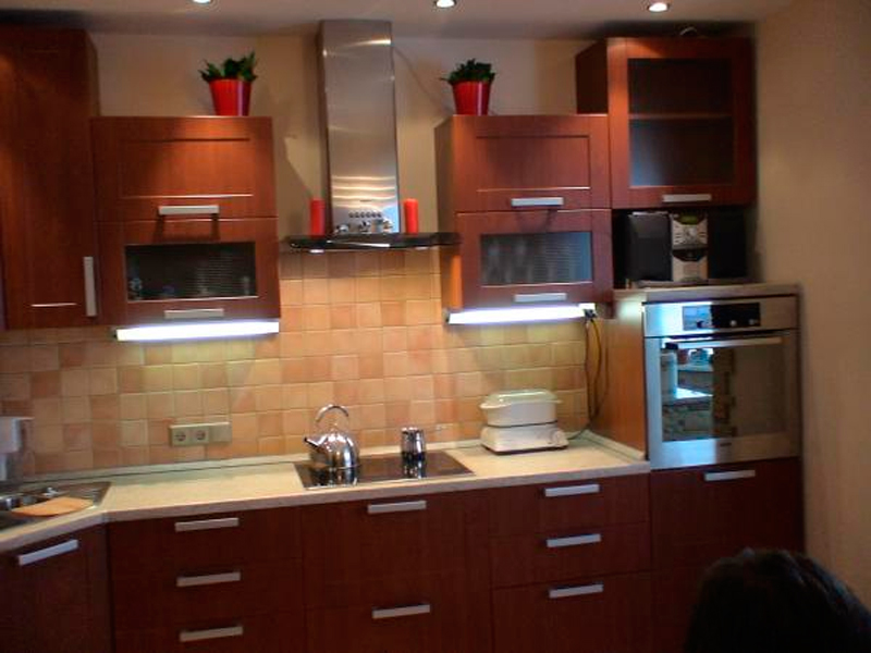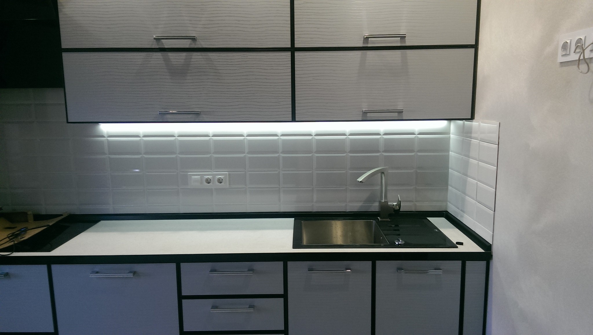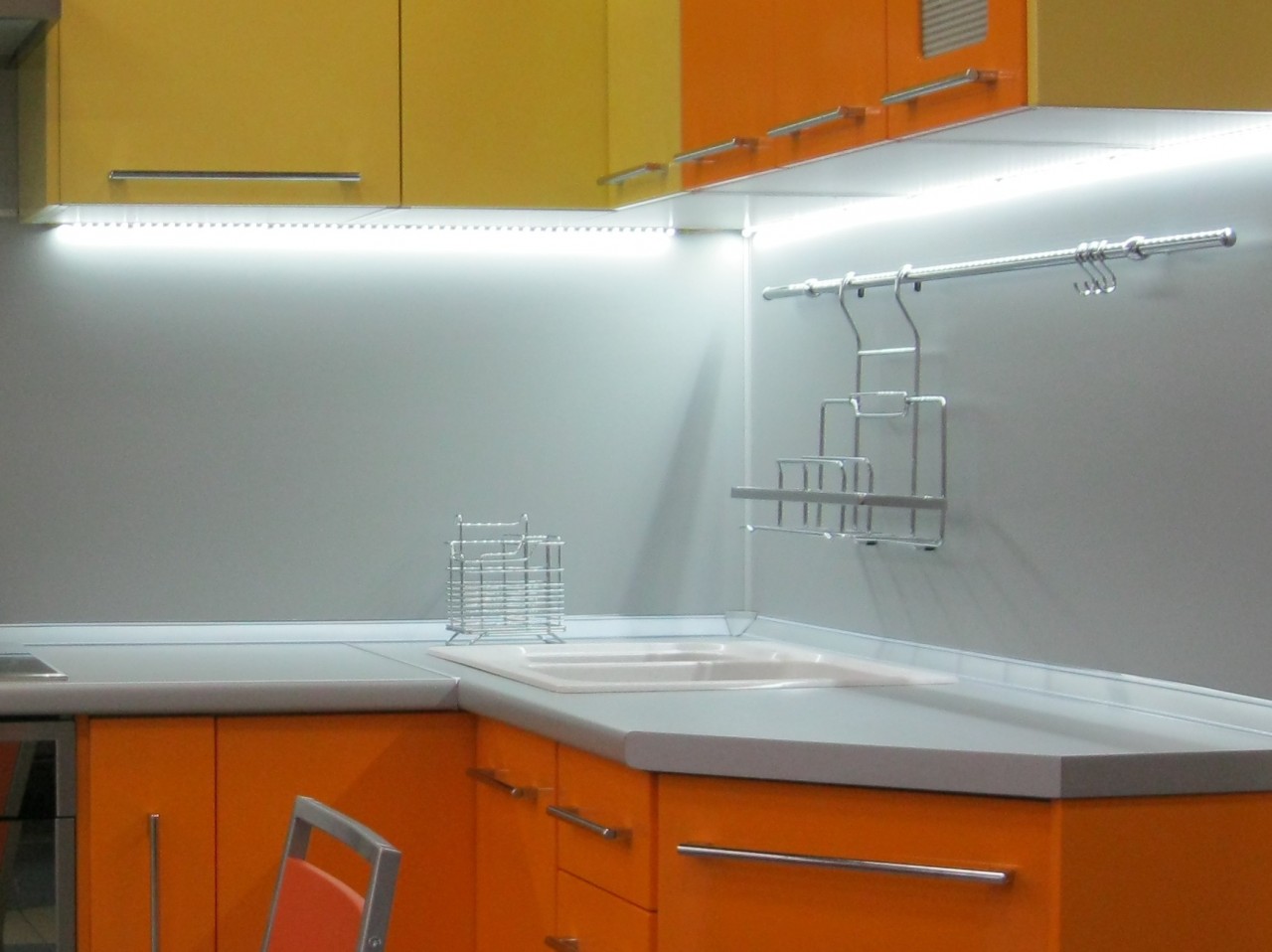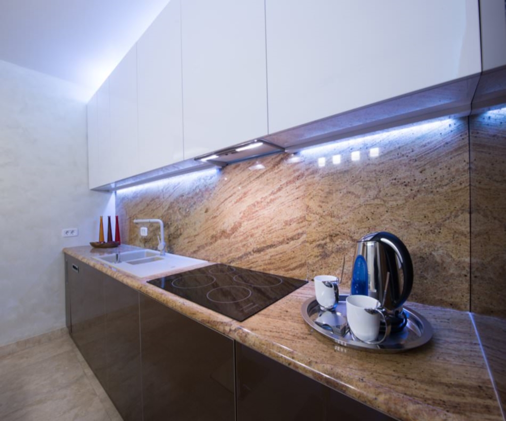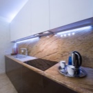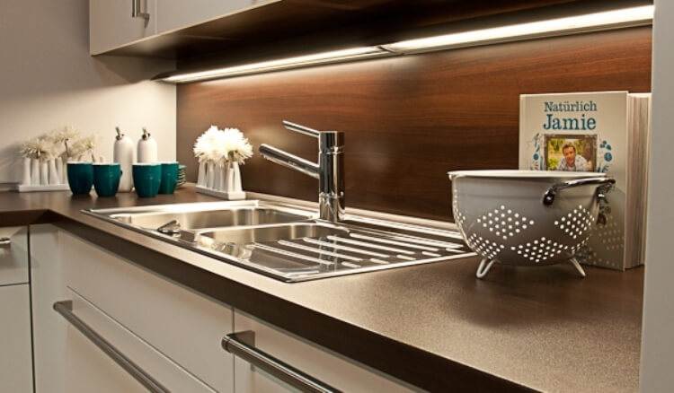 Die neueste Lösung ist eine der neuesten und trendigsten, um eine Küchenschürzenbeleuchtung zu schaffen. Sie installieren einfach eine Lampe in den Möbeln und schaffen so eine futuristische Atmosphäre. Ergänzen Sie die Zusammensetzung wird Strahler sein, an der Unterseite des Wandgehäuses in Form von Halogenlampen.Welches Material Sie auch für die Gestaltung der Tischplatte, der Schürze oder der Beleuchtung wählen, spielt eine wichtige, wenn nicht die wichtigste Rolle.