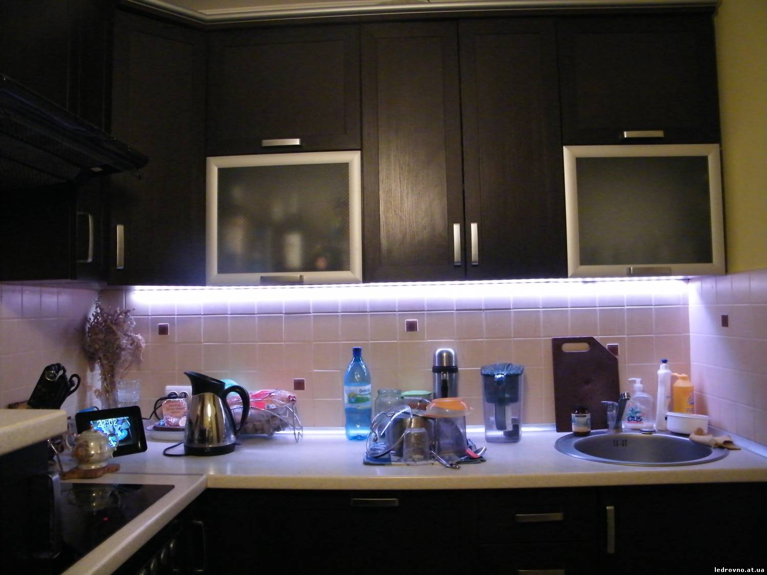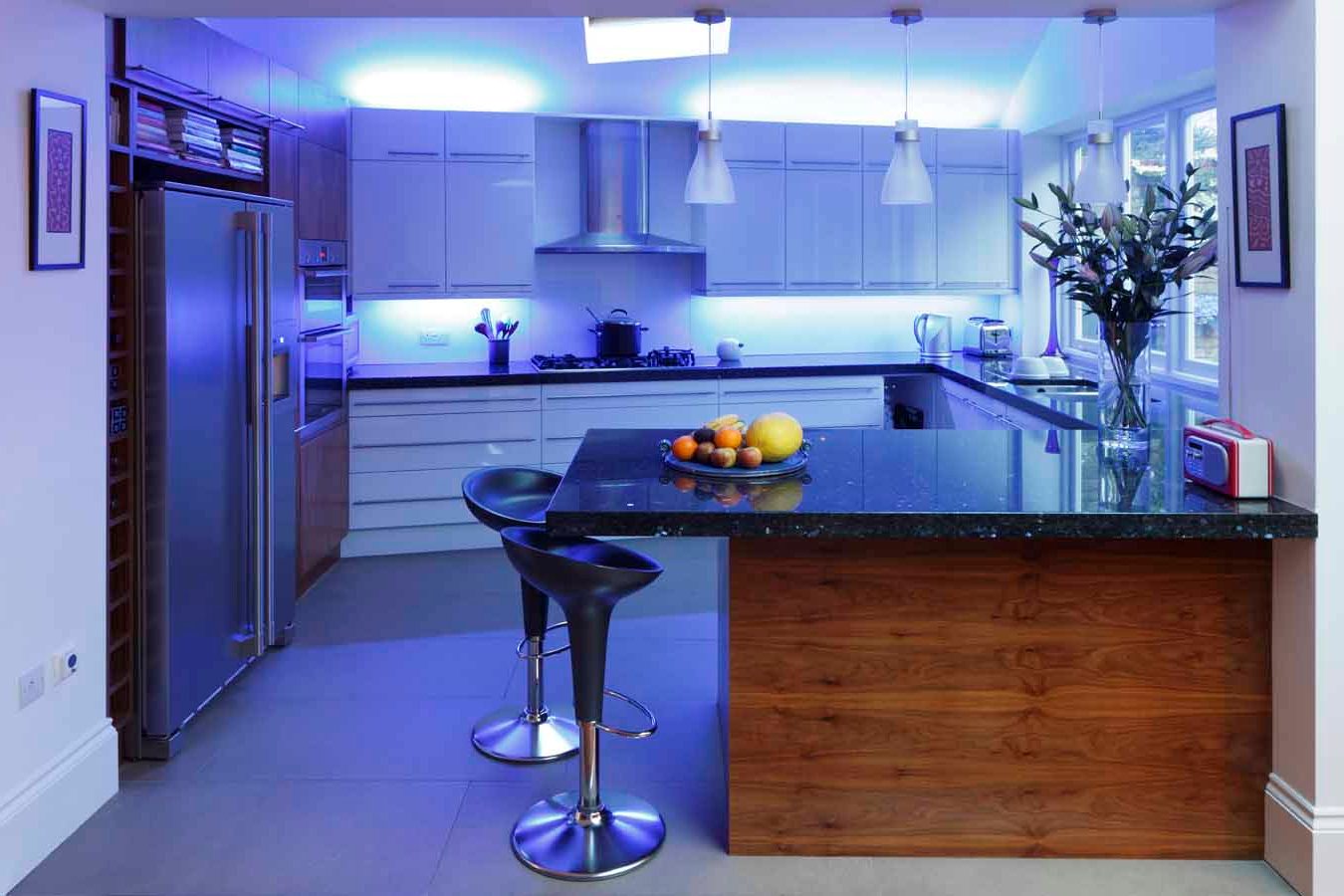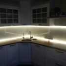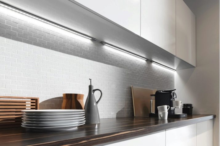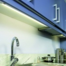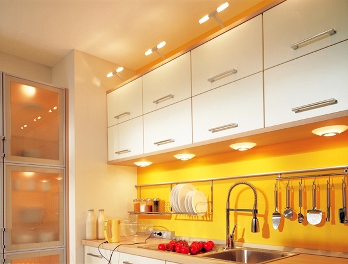 Energieverbrauch hier - das Minimum (12 W), aber die Vorstellungskraft der Designer kann maximal "durchstreifen". Das Prinzip der Installation dieses Designs ist ziemlich einfach. Die dekorativen äußeren Merkmale der LED-Lampen werden den Innenraum einer Küche aller Stilrichtungen, von der klassischen bis zur modernen Hi-Tech, Fusion, Provence usw., nicht im geringsten stören.