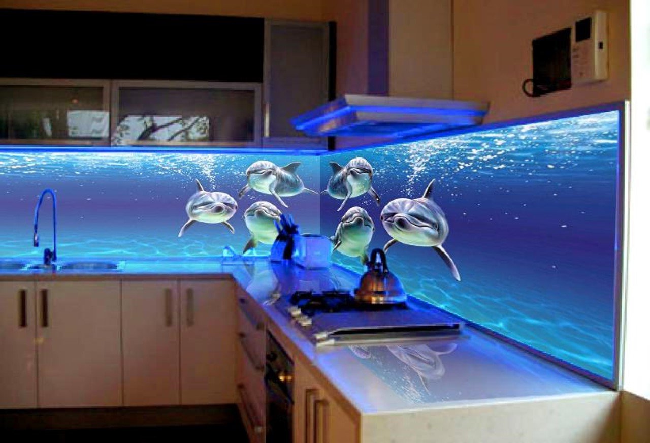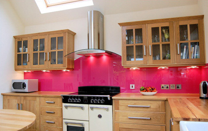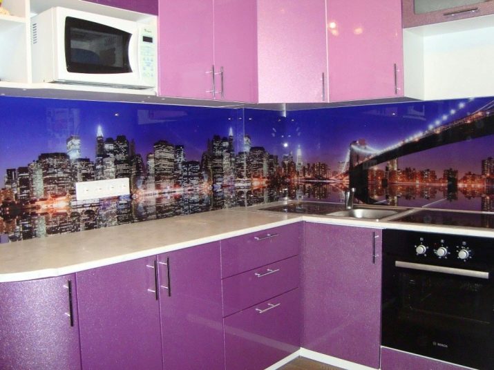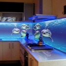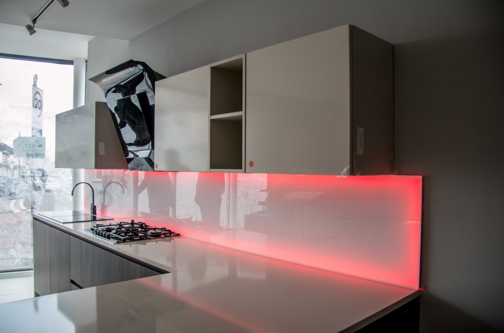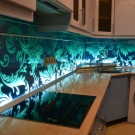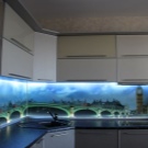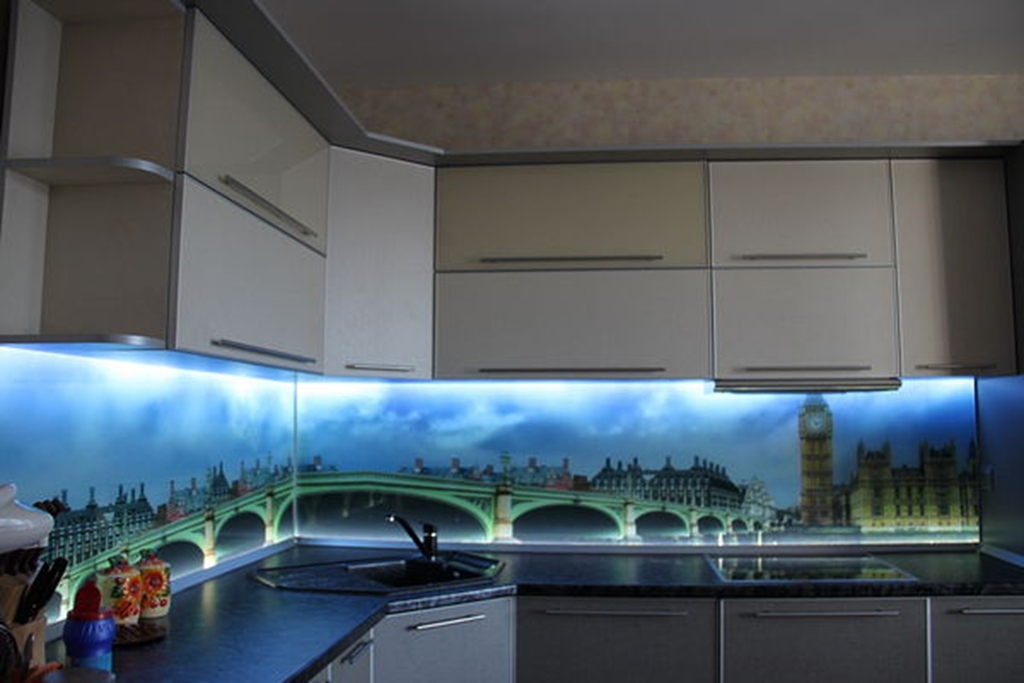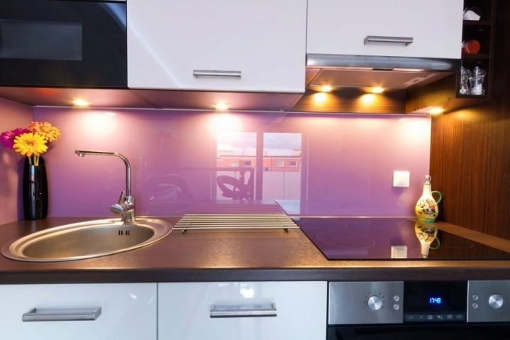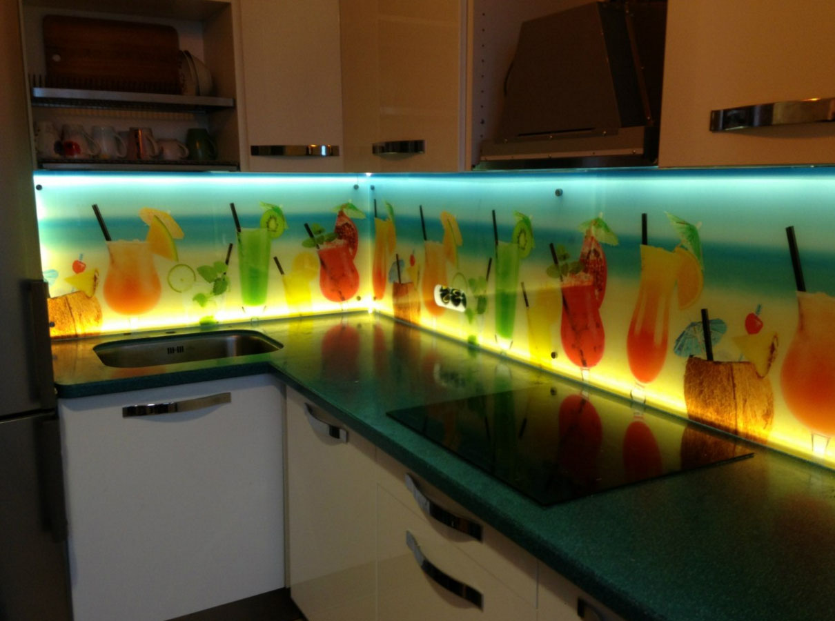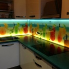 Eine der wirkungsvollsten Lösungen für den Ort, an dem Sie Ihre kulinarischen Meisterwerke kreieren, ist eine Glasschürze oder skinali mit Licht. Silikatglas toleriert Temperaturabfälle, verformt sich nicht, zeigt hervorragende Hygiene. Da sich kein Schmutz ansammelt - Bakterien vermehren sich nicht, Pilze und Schimmel bilden sich nicht. Unter solchen Bedingungen können Sie interessante Beleuchtung mit LED-Streifen anpassen.
