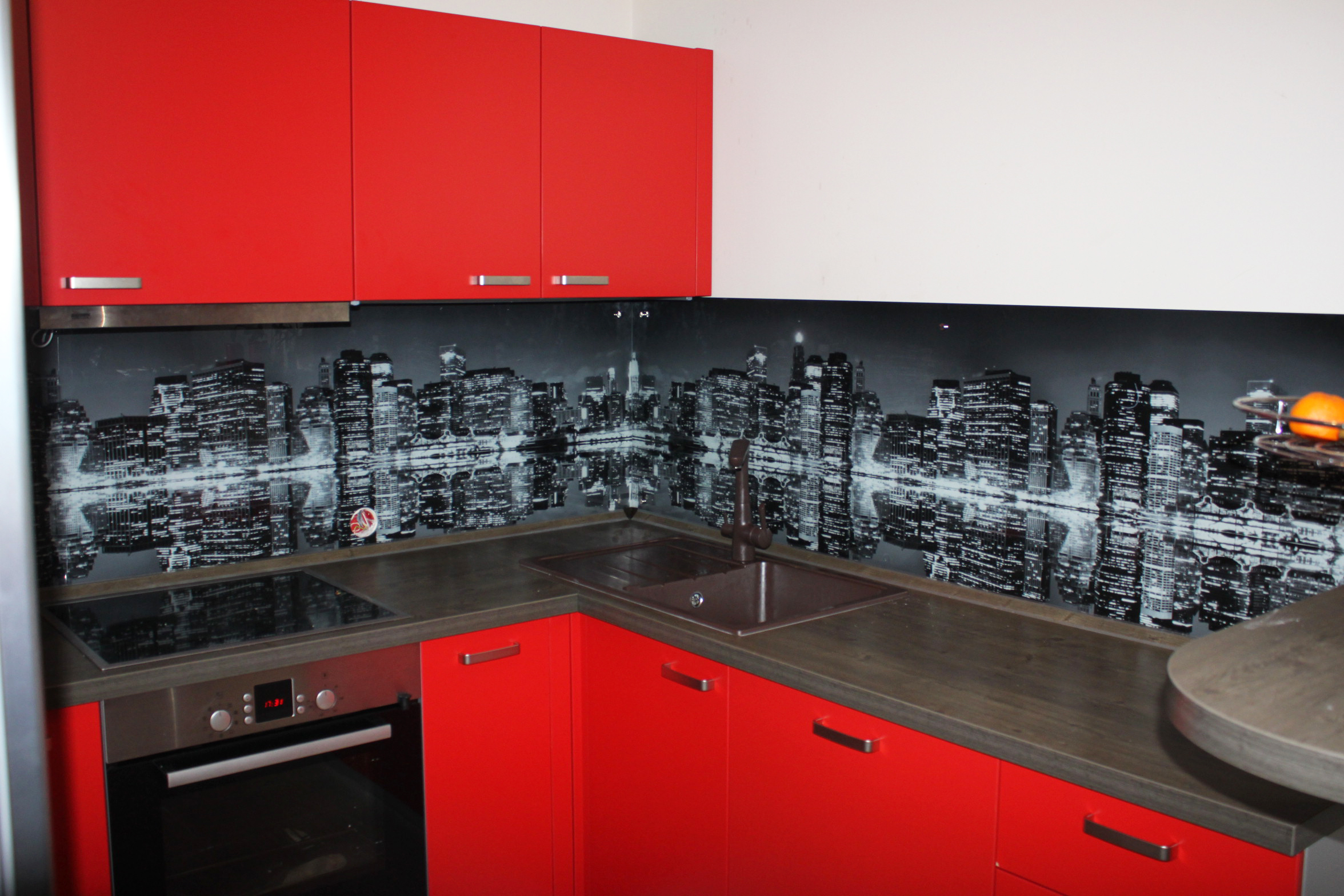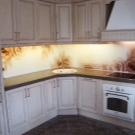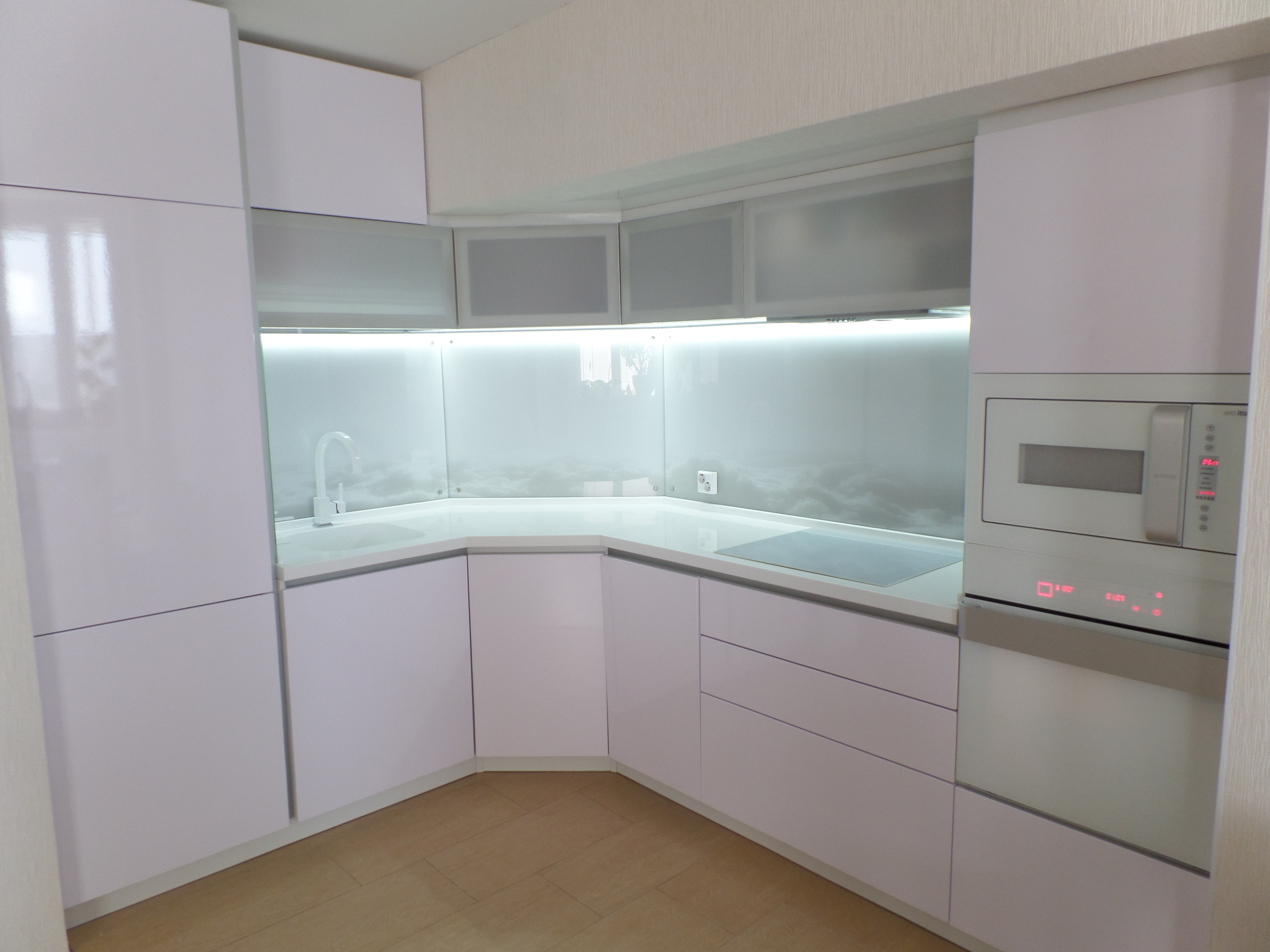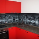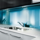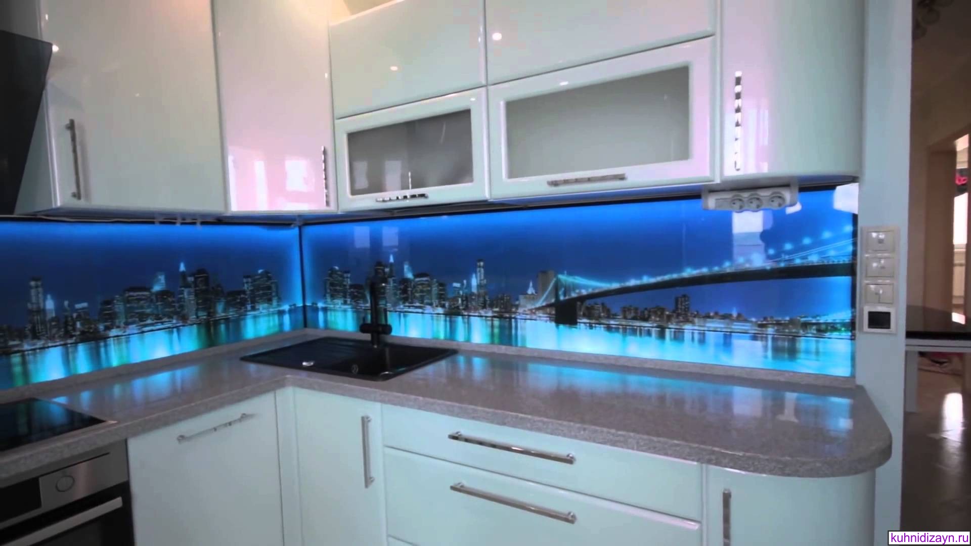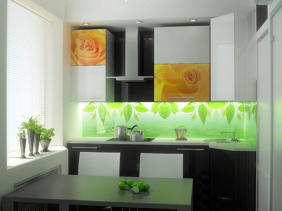 Eine der wirkungsvollsten Lösungen für den Ort, an dem Sie Ihre kulinarischen Meisterwerke kreieren, ist eine Glasschürze oder skinali mit Licht. Silikatglas toleriert Temperaturabfälle, verformt sich nicht, zeigt hervorragende Hygiene. Da sich kein Schmutz ansammelt - Bakterien vermehren sich nicht, Pilze und Schimmel bilden sich nicht. Unter solchen Bedingungen können Sie interessante Beleuchtung mit LED-Streifen anpassen.