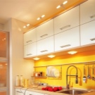 Eine gute Lösung für die Gestaltung der Küche Raum mit Hilfe von Lampen wird montiert werden, Overhead oder eingebettete Halogene. Kapselmodelle, die einfach in Möbeln montiert werden, gelten als die beliebtesten. Sie sollten in einer bestimmten Lücke platziert werden, gleichmäßig entlang der Unterseite der Hängemöbel. So können Sie den Arbeitsbereich beleuchten und sich so die optimalen Bedingungen zum Kochen schaffen.Das Design der Ecke wird mit Deckenleuchten dekoriert, die sich zwischen den oberen Schränken und der Wand befinden.