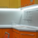 Die beliebteste Option zur Beleuchtung der Küche ist die LED-Beleuchtung. Sie können sowohl einzelne Glühbirnen als auch einen soliden LED-Streifen erwerben. Wie die Praxis gezeigt hat, hat LED-Leuchten die größte Liste von Vorteilen. Neben einer langen Lebensdauer ist es weniger erhitzt als der Rest, es kann in verschiedenen Farben leuchten, ohne ein komplexes Filtersystem zu haben.
