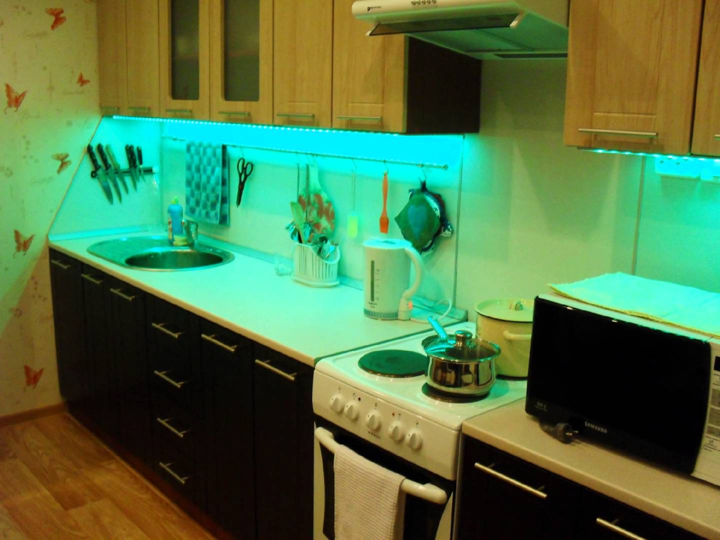 Bevor Sie ungewöhnliche Beleuchtung in Ihrer Küche installieren, lesen Sie die Bewertungen derjenigen, denen es gelungen ist, eine fantastische Atmosphäre im Haus zu schaffen. Benutzer prahlen mit ihren Ideen, teilen Ergebnisse und demonstrieren Foto-Handwerk. Richtige Beleuchtung kann aus einer "billigen" Küche echte Wohnungen machen. Dazu müssen Sie eine Außenbeleuchtung mit guter Ausleuchtung des Arbeitsbereichs installieren. Die interne Beleuchtung mit Hilfe von LED-Streifen, flexibel, farbig, in der Lage, in jeder Ebene, einschließlich Skinali platziert werden, wird relevant.