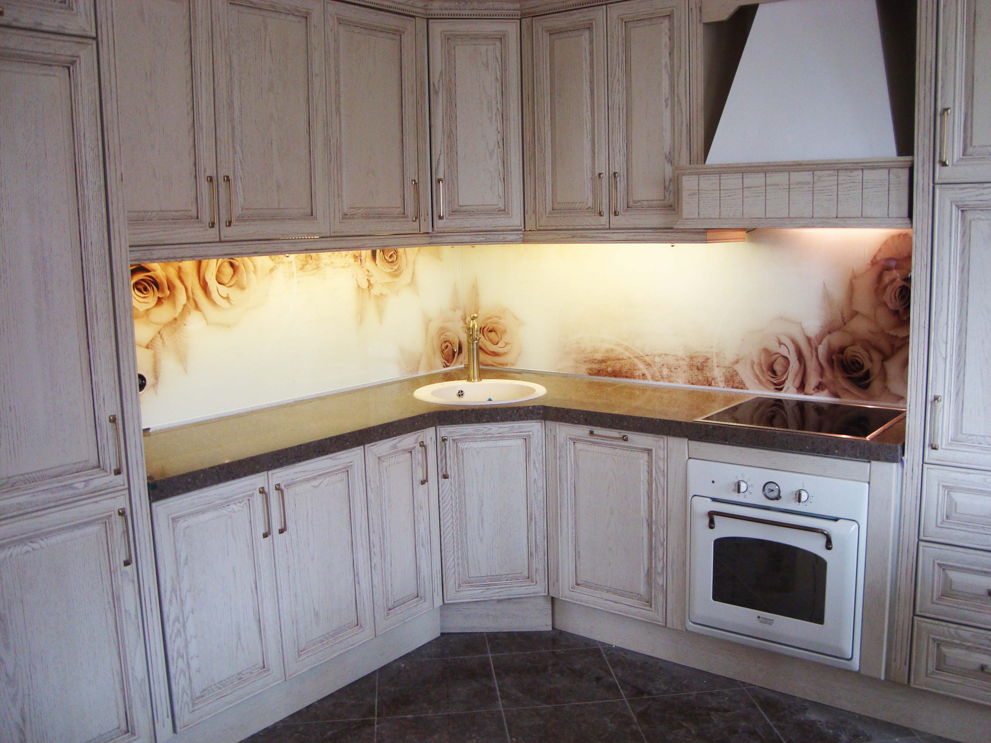Übrigens, diese Technik wird für den Fall, dass Sie Keramikfliesen, PVC-Platten, "Schwein" mit einem interessanten Muster verwenden. Mit der richtigen Beleuchtung können Sie sogar einen 3D-Effekt erzielen und so eine unglaublich schöne und helle Atmosphäre in der Küche schaffen.