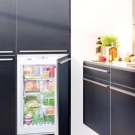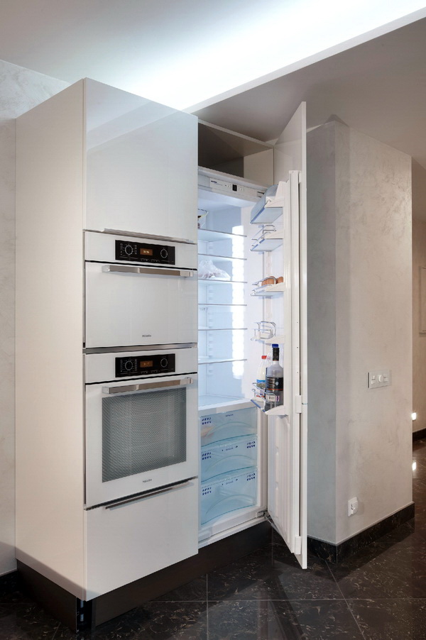 - Attraktives Designin denen Formen, Linien und Proportionen harmonisch kombiniert sind. Kühlschränke gibt es in verschiedenen Farben: Weiß, Schwarz, Beige, Silber, Gold und Rot. Unter ihnen gibt es Optionen mit einer matten, glänzenden und spiegelnden Oberfläche, die es Designern ermöglicht, die originellsten Lösungen zu implementieren.