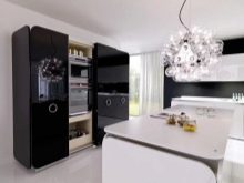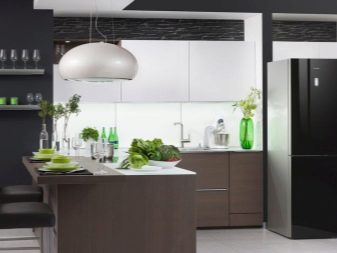 Der schwarze Farbton ist ein unbestrittener Akzent im Raum und macht es notwendig, das Design dem Ton anzupassen. In der Küche verbringt ein Mensch bis zu 60% seiner Zeit, daher ist es notwendig, den Innenraum sehr sorgfältig einzurichten. Scheuen Sie sich jedoch nicht vor kühnen Designlösungen wie einem Kühlschrank aus schwarzem Glas.