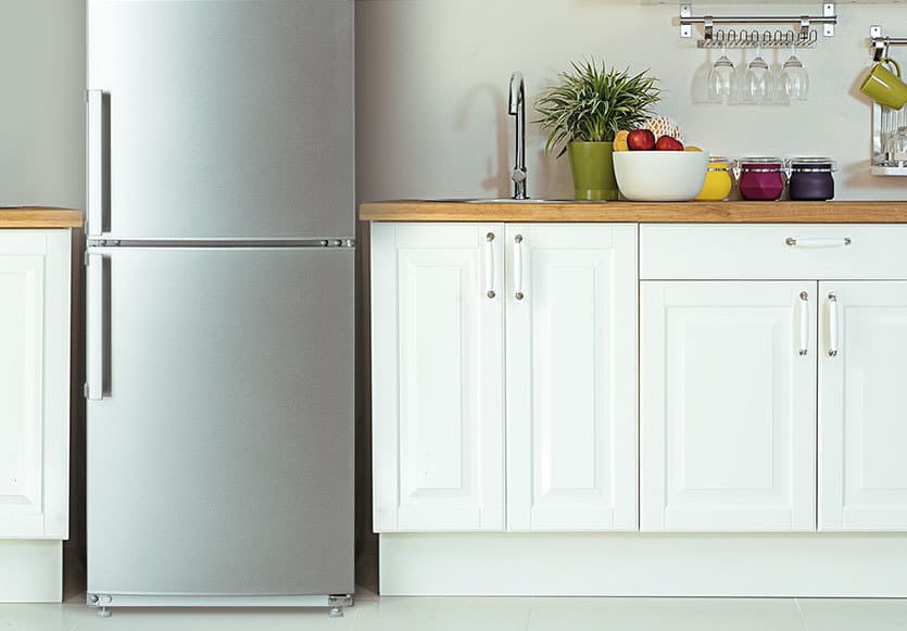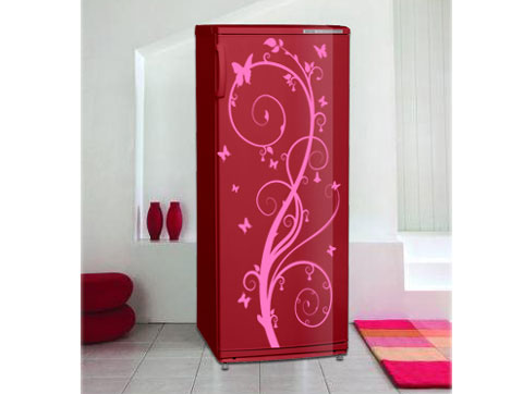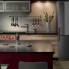 Wählen Sie einen hellen Kühlschrank und versuchen Sie nicht, alle Geräte in der gleichen Farbgebung zu wählen. Es wird interessant sein, eine Kombination von roten und schwarzen oder weißen Haushaltsgeräten zu sehen. Sieht gut aus grünen und silbernen Farben.