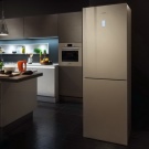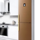 Dieses Modell ist in zarter Beige Farbe und ist perfekt für Besitzer, die Pastellfarben lieben. Im Inneren ist es so geräumig wie die vorherigen, hat ein komplettes System "Kein Frost"Super-Tiefkühl-, Super-Kühl-und Sound-Anzeige. Der Kühlschrank ist sehr geräumig, hat aber einige Unterschiede zu den vorherigen beiden. Im oberen Fach gibt es zwei verstellbare Regale, eine große Schublade und eine ausziehbare Schublade."Frischezone", in dem die Temperatur konstant bei Null Grad gehalten wird. Es gibt auch einen speziellen Halter für Flaschen. Im unteren Gefrierfach gibt es drei geräumige Fächer.