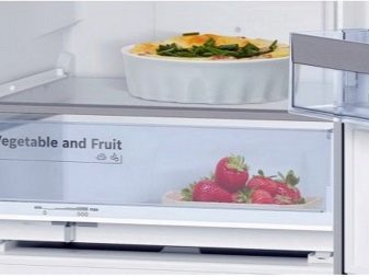 Im Gefrierschrank sind drei breite Schubladen für die Aufbewahrung von Lebensmitteln. Es ist erwähnenswert, dass jede Kamera ihre eigenen Tasten hat, um die Temperatur einzustellen. Es gibt auch einen akustischen Indikator, eine antibakterielle Beschichtung und einen speziellen Energiesparmodus, um weniger Energie zu verbrauchen.