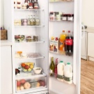 Die Tür erfreut uns auch mit vier festen Regalen, auf denen nicht nur verschiedene Kleinigkeiten und Eier passen würden. Sie können hier eine große Schachtel oder eine Flasche Saft oder anderes Getränk frei platzieren.