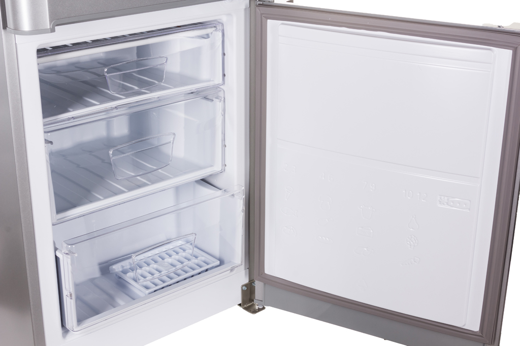 Im Gefrierschrank mit einem statischen Kühlsystem gibt es drei Abschnitte mit drei Schubladen zum Gefrieren sowie einen Eisbehälter.