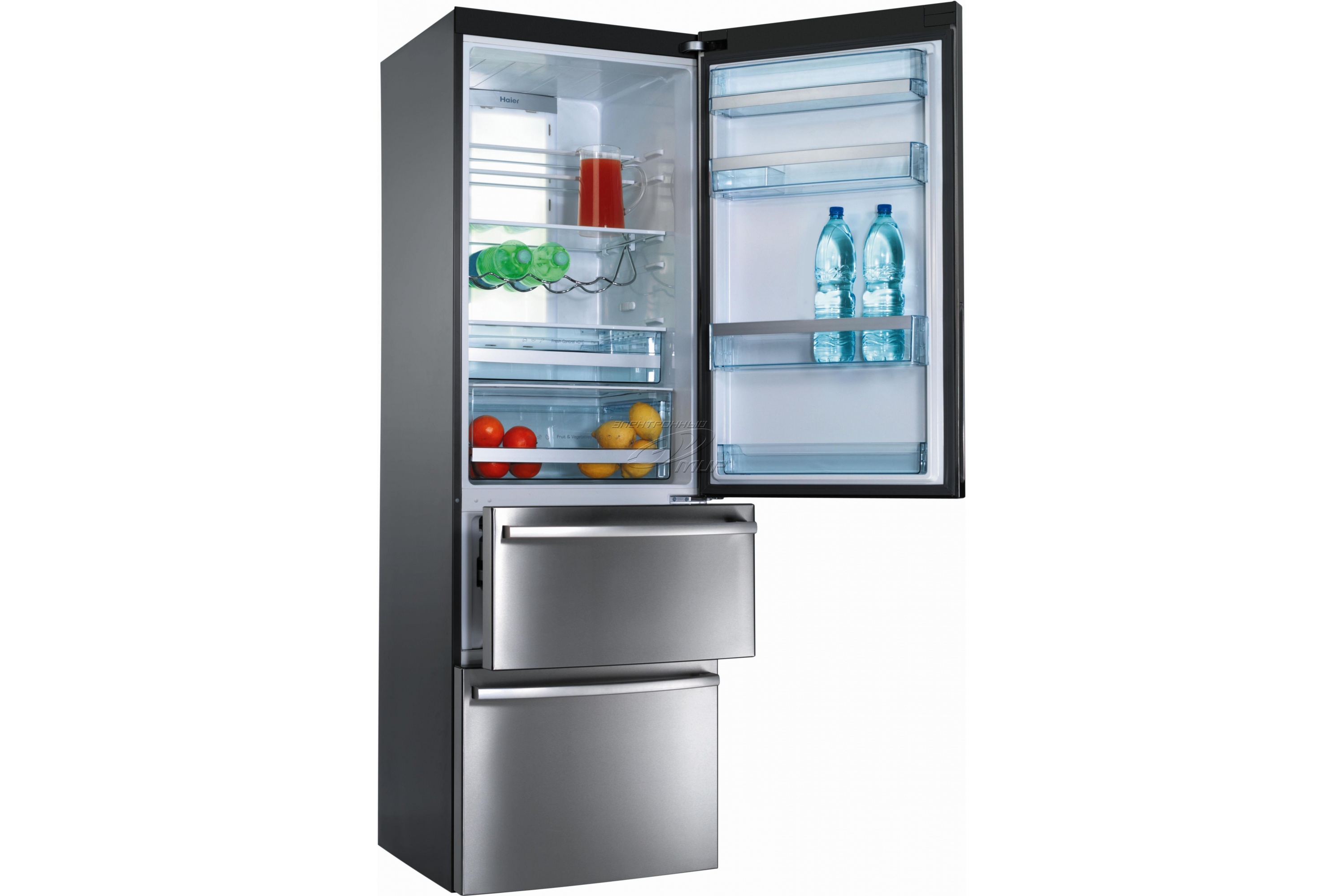 Bei diesem Zweikammermodell wurde die innere Ergonomie leicht "aufgepumpt". Reduzierte die nutzbare Fläche des oberen Regals, das von der Lampe eingenommen wird. Jetzt werden nur noch ein paar Kleinigkeiten passen. Aber mit dem Rest ist alles in Ordnung. Das mittlere Regal ist so geräumig, dass es für Liebhaber von Borschtschkoch so viel, dass es 5 Tage dauert (sie sagen, es schmeckt besser, wenn es Infusionen), wird es definitiv in den größten Topf passen.