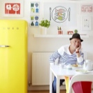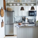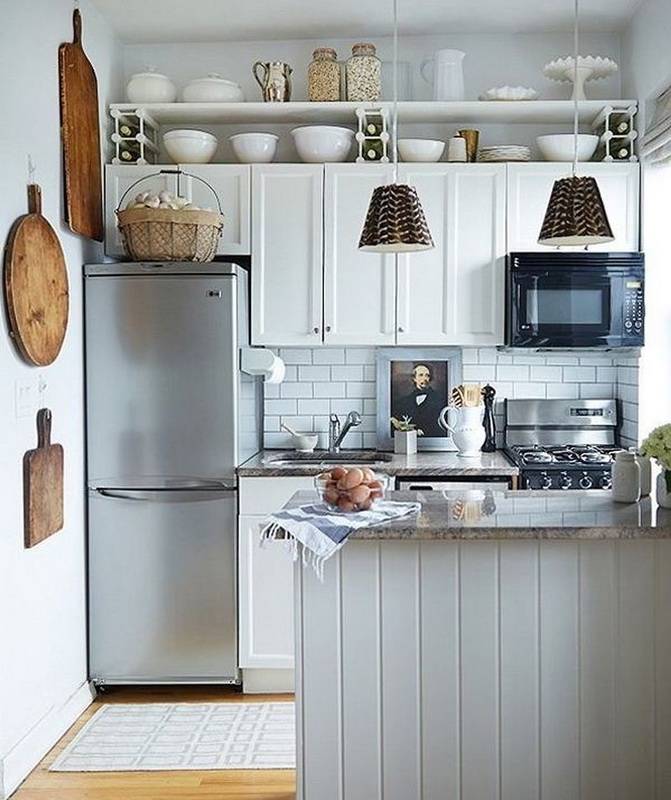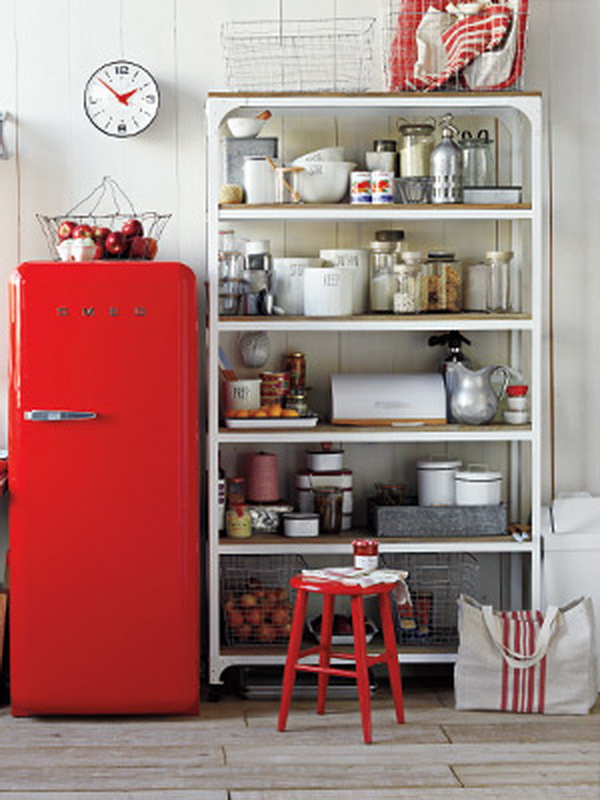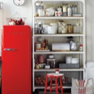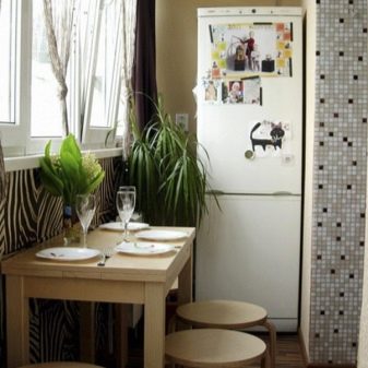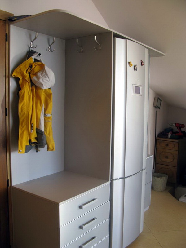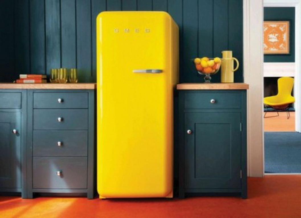 - Am Eingang in die Küche. Wenn Sie dem Kücheninneren helle Möbel hinzufügen und Dekoration hinzufügen, wird das Zimmer optisch geräumiger. Eine andere interessante Lösung ist ein heller Kühlschrank mit einem originellen Design.Außerdem können Sie einen Edelstahl-Kühlschrank kaufen und ihn mit Geräten aus dem gleichen Material kombinieren.