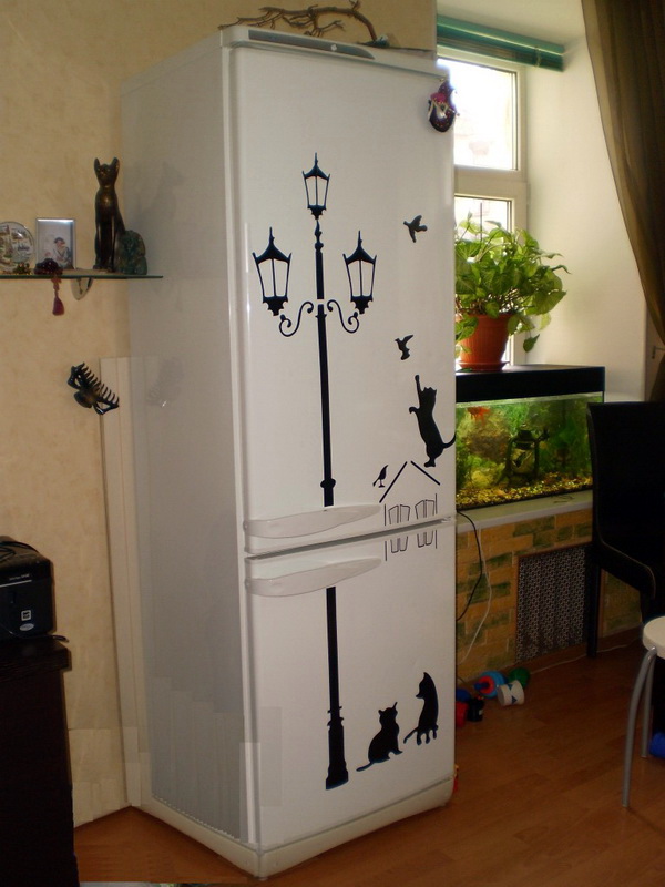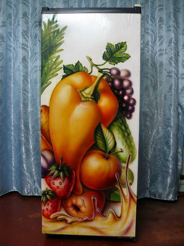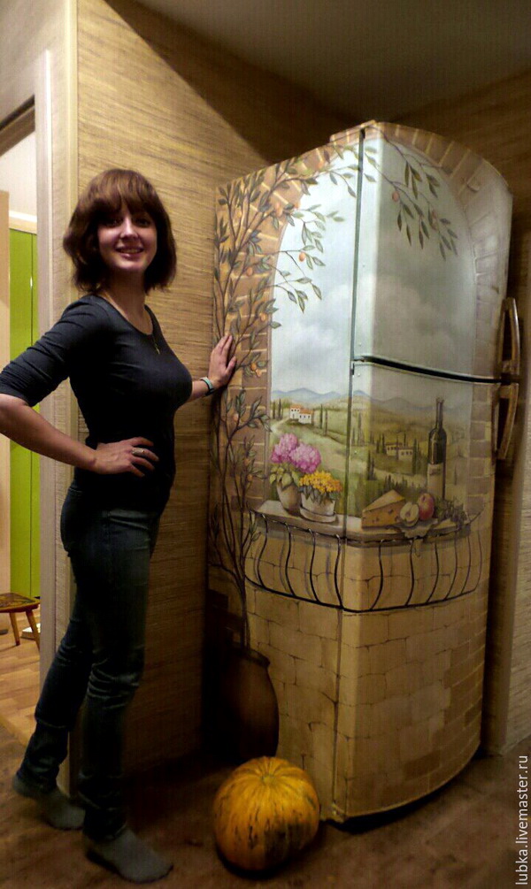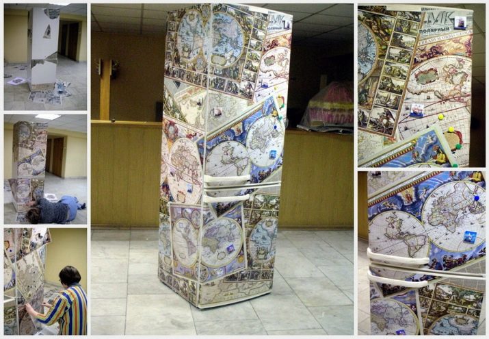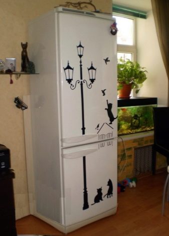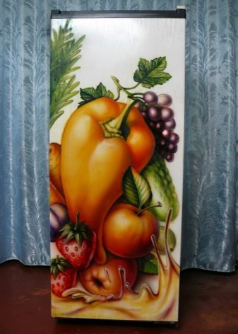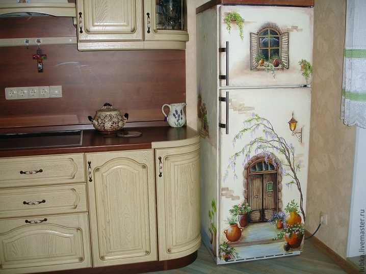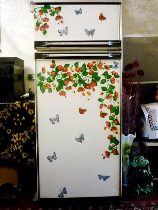 Eine weitere großartige Lösung ist Decoupage, für jeden Stil des Kühlschranks wird ein Muster ausgewählt: