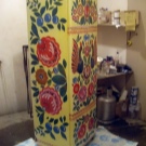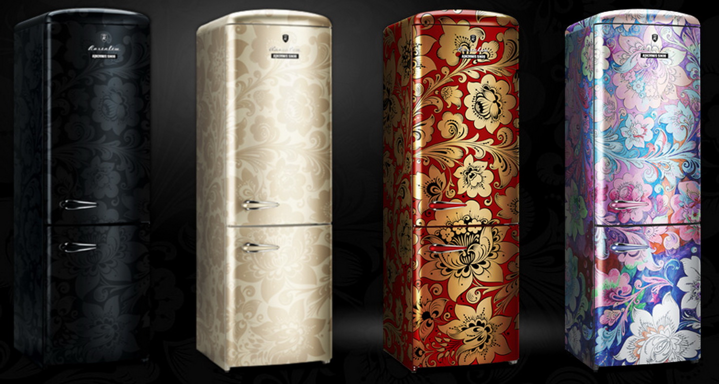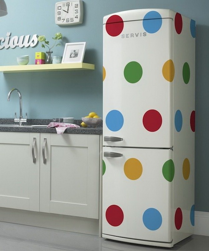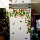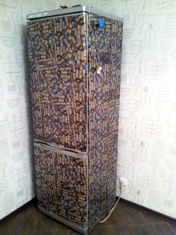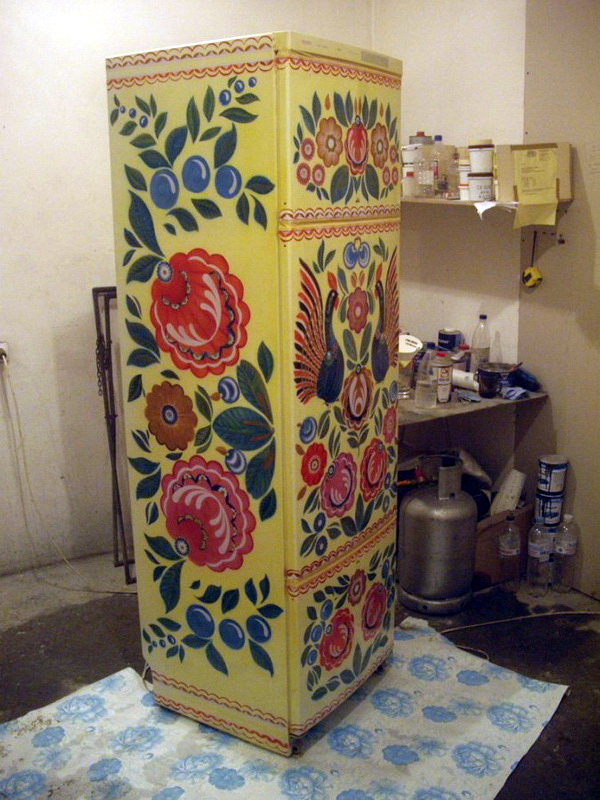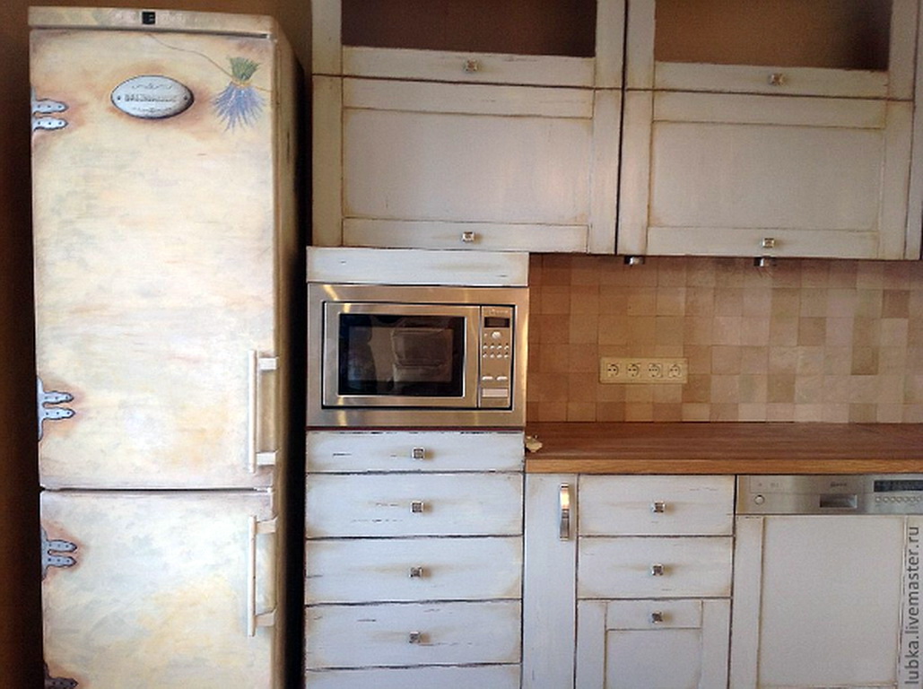 Eine weitere großartige Lösung ist Decoupage, für jeden Stil des Kühlschranks wird ein Muster ausgewählt:
