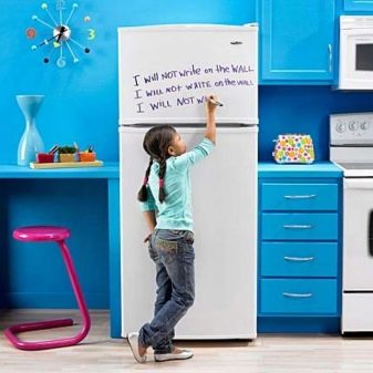 - "Amana Jot-Erase". Maytag hat das Gerät hergestellt "Amana Jot Trockenlöschung"Die Beschichtung dieses Kühlschranks kann die Rolle eines Whiteboards für das Zeichnen mit einem Filzstift spielen. Kinderzeichnungen werden leicht mit einer Serviette gelöscht.