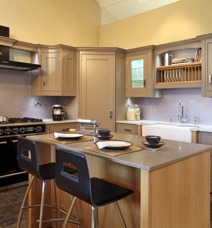 Wenn der Küchenboden und die Arbeitsplatte schokoladenbraun gefärbt sind, dann ist eine ausgezeichnete Ergänzung zu ihnen ein zusammengesetzter Farbton aus Elfenbein (eine Art Beige).
