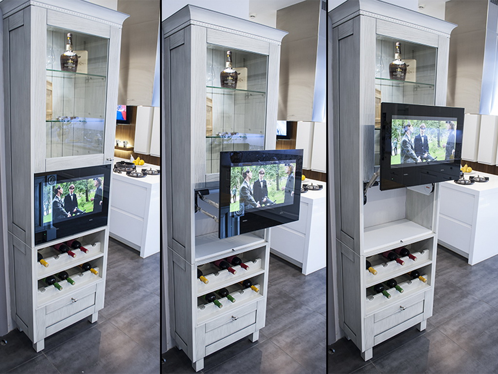 - Einbetten in den Schrank. Eine andere vorteilhafte Lösung besteht darin, das gesamte Gerät in der Küche hinter der Möbelfassade zu verstecken. In dieser Position sieht das Gerät wie ein Schrank mit einer Tür aus und ist vor dem Hintergrund des Headsets unsichtbar.