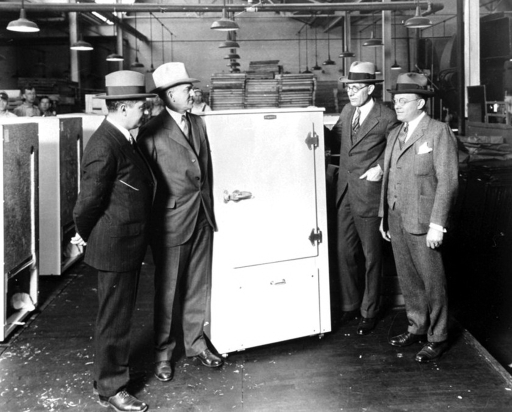 Und erst im Jahr 1926 enthüllte Christian Steenstrup der Welt den ersten Kammerkühlschrank, der für Zuhause, leise und sicher akzeptabel war. Der Kompressor und der Elektromotor dieses Gerätes waren unter der Haube. Das Design der Einheit wurde von der Firma patentiert. General Electric.