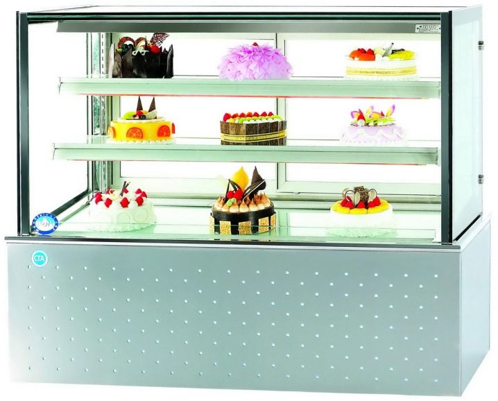 - Für Kuchen. Geschäfte sind mit einer ähnlichen Anzeigetechnik ausgestattet. Die Palette solcher Kühlschränke ist breit: von vertikalen Schränken von bescheidener Größe bis hin zu großen horizontalen Vitrinen. Jeder Typ hat eine transparente Tür und viele Regale, zwischen denen der Abstand verändert werden kann. Die Einheiten unterscheiden sich in der Position (Desktop oder Boden) und in der Handelsoption, für die sie erworben wurden (das Modell kann geschlossen oder offen sein). Meistens wird in solchen Konstruktionen die positive Temperatur beibehalten, sie variiert von Null bis 12 Grad.