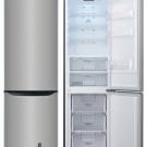 Diese Kühleinheit öffnet die Bewertung der besten Kühlschränke in der LG-Linie. Die Größe des Kühlschranks beträgt 255 Liter, und die Gefrierkapazität beträgt 105 Liter, wodurch Sie eine große Menge an Lebensmitteln lagern können. Der Kompressor arbeitet mit einem linearen Wechselrichtertyp und zusätzlich mit der Funktion No Frost.Es passt perfekt in jedes Interieur, hat eine kompakte Größe und hat eine klassische Form.