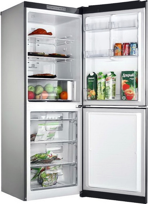 Das Modell ist in Schwarz gehalten und verfügt über eine Vielzahl von modernen Updates: eine Drei-Kammer-Bauweise, die Funktion der Erhaltung von Vitaminen, ein elegantes, stilvolles Design und eine matte Oberfläche. Der Geräuschpegel ist 25% geringer als bei anderen Modellen und ein spezieller Filter reinigt die Luft im Kühlschrank.