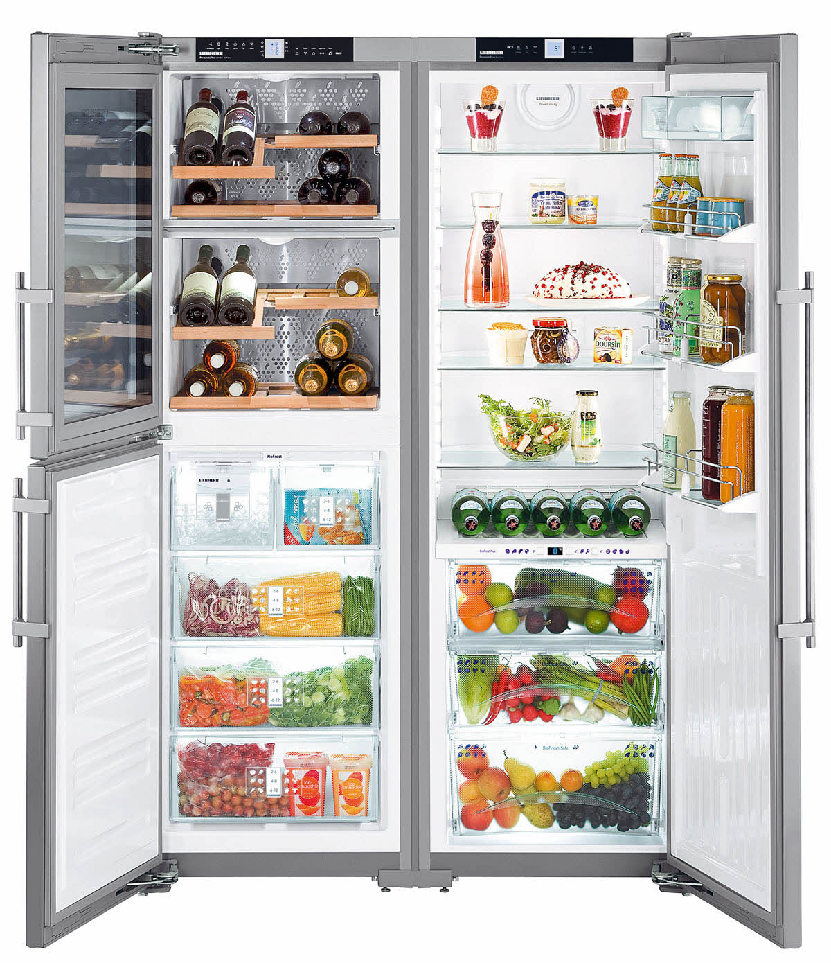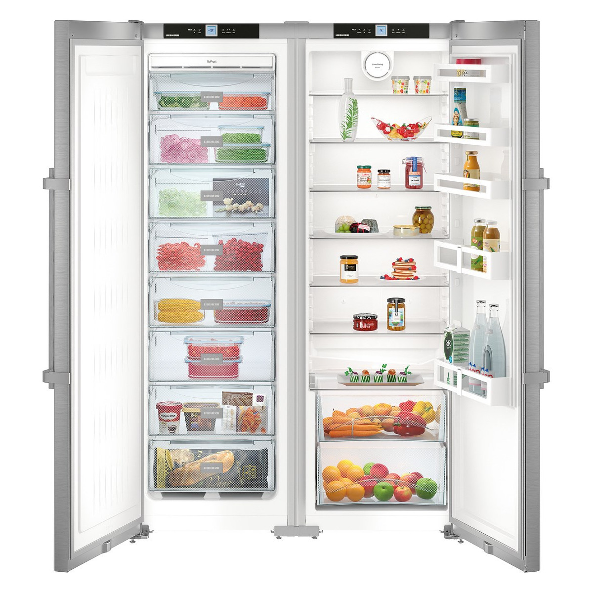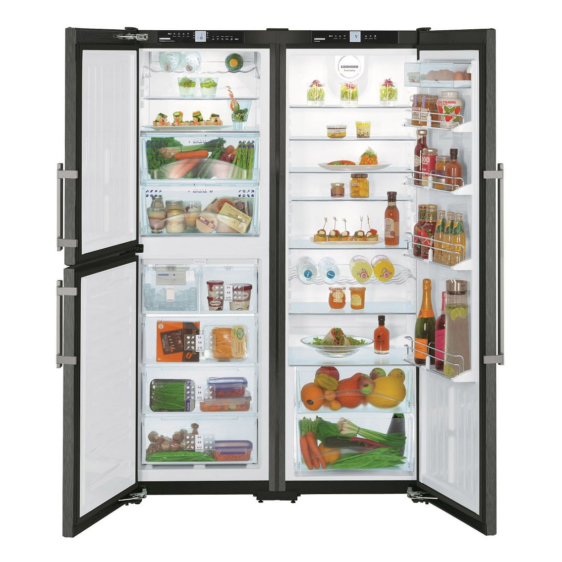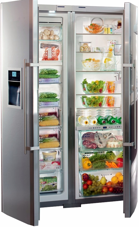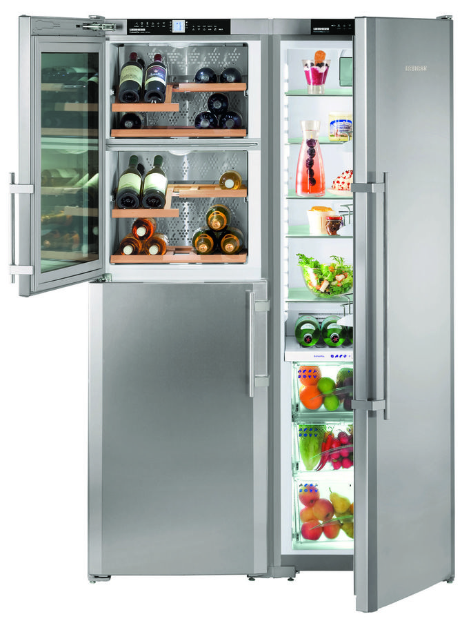Die "Side by Side" -Serie repräsentiert die Klasse der größten Liebherr-Geräte. Zwei Kühlschränke werden zum Kühlen von zwei Kompressoren verwendet, und das durchschnittliche Nutzvolumen in ihnen beträgt 650 Liter.