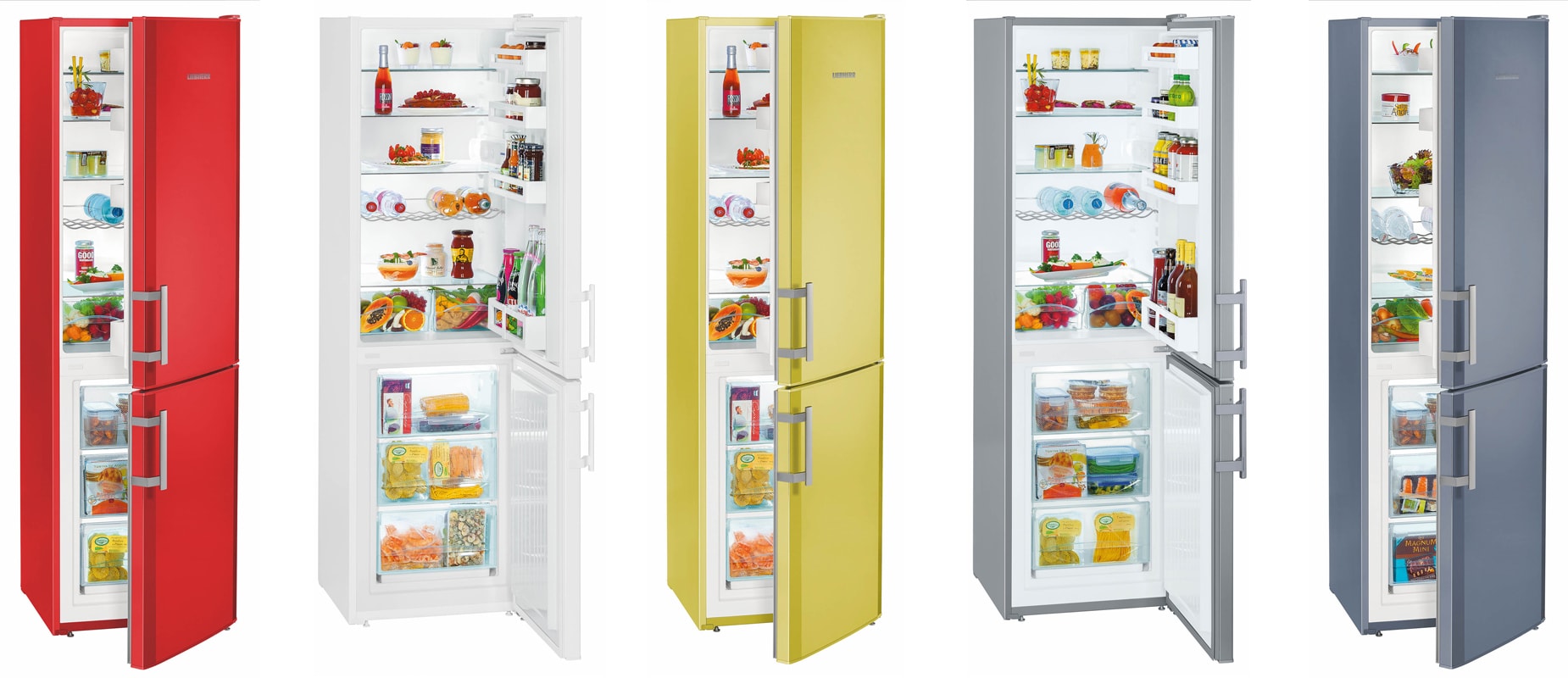 Die beliebtesten Geräte in Weiß, Beige, Silber Fällen. Beliebt ist die Farbe von Edelstahl und sattem Grau. Und wer den Kühlschrank in der Küche zum Blickfang machen möchte, für den stellt Liebherr klassische Modelle in vielen leuchtenden Farben her: burgunderrot, grün, golden, braun, schwarz.