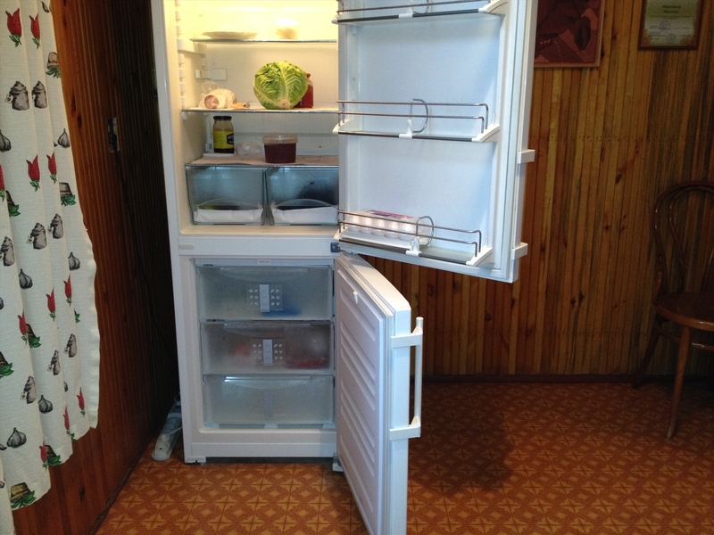 Der nächstgrößere Kühlschrank mit einer Breite und Tiefe von 55 cm, bis zu 160 cm hoch und einem Gefrierschrank fasst bis zu 160 Liter.