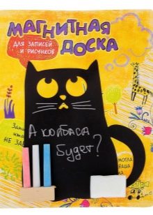 Zusätzlich zu der funktionalen Seite des obigen Zubehörs gibt es eine dekorative Eigenschaft. Dank einer großen Auswahl an Formen und Größen können Sie die perfekte Wahl für die Größe des Kühlschranks und die Einrichtung der Küche treffen. Wenn das Design des Raumes florale Elemente auf Gardinen, Tapeten, Tischdecken und anderen Objekten enthält, können Sie sich für eine magnetische Tafel in Form einer Blume entscheiden. Für den Fall, dass Früchte in der Einrichtung sind, dann ist ein Brett in der Form eines Apfels, Birne, Ananas und anderen Früchten oder Beeren perfekt. Für diejenigen, die sich ihr Leben ohne Haustiere nicht vorstellen können, sollten Sie das Brett in Form einer Katze oder eines Hundes genießen. Naschkatzen wählen ein Accessoire in Form eines appetitlichen Cupcake oder Eis.Auch in den Geschäften finden Sie Produkte in Form von beliebten Figuren aus Märchen und Cartoons.