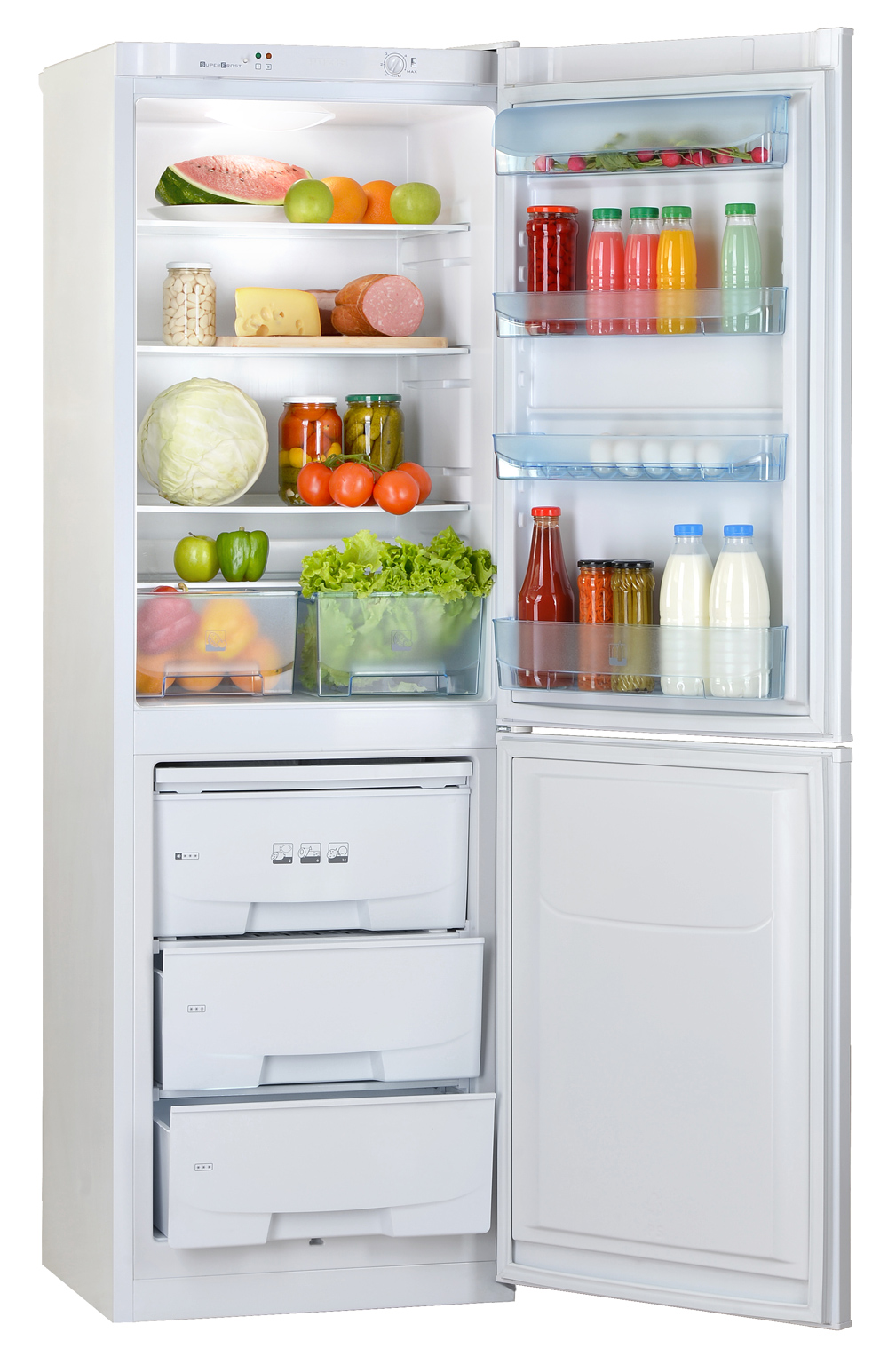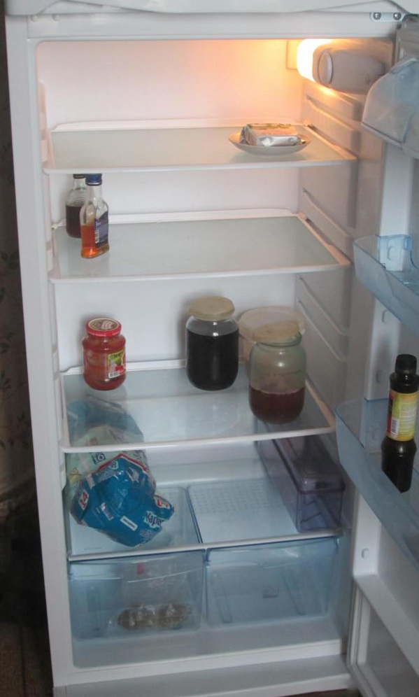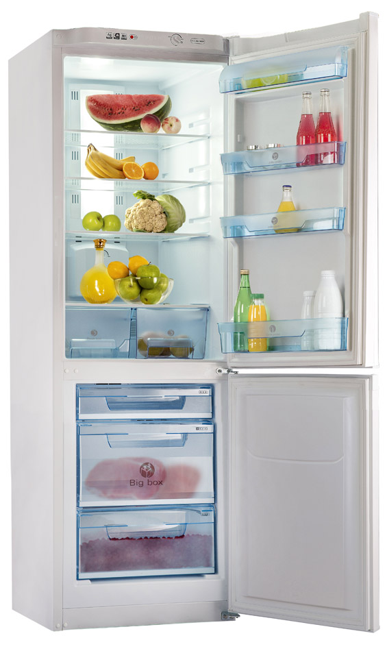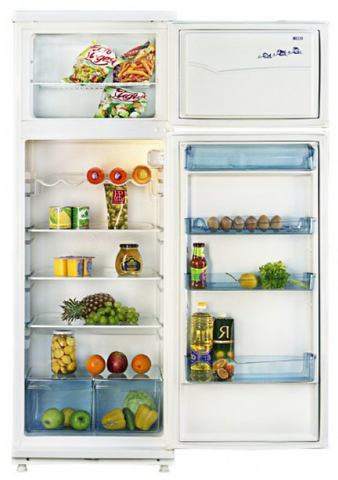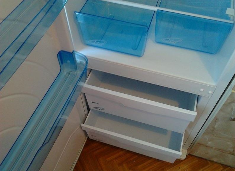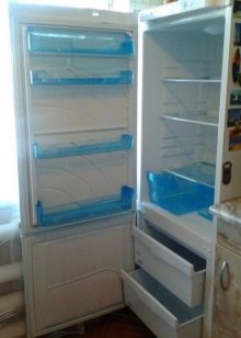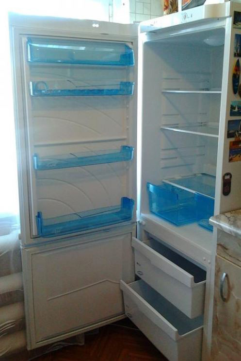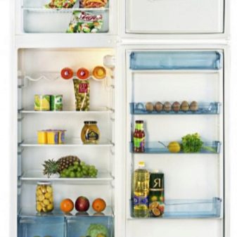 An der Tür des Kühlraums befinden sich Regale für die Lagerung von Produkten, und diese Regale können dank der verfügbaren Befestigungen auf verschiedenen Ebenen eingestellt werden. Im Tiefkühlfach befinden sich zwei Schubladen für die Langzeitlagerung von Tiefkühlkost wie Fleisch oder Fisch. Die Luft wird durch einen hermetischen Kompressor, einen Kondensator, einen Filtertrockner, eine Kapillarröhre und einen Verdampfer mit zwei Temperaturbedingungen gekühlt. Somit wird ein geschlossenes System erhalten, in dem kalte Luft zirkuliert. Der Temperaturmodus wird aufgrund des periodischen Ein- und Ausschaltens des Kompressors aufrechterhalten, was auf Kosten des Thermostaten geht.