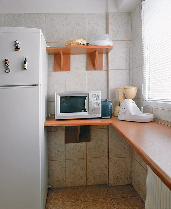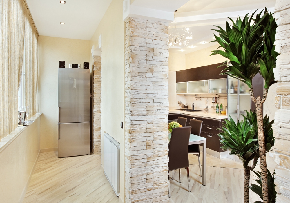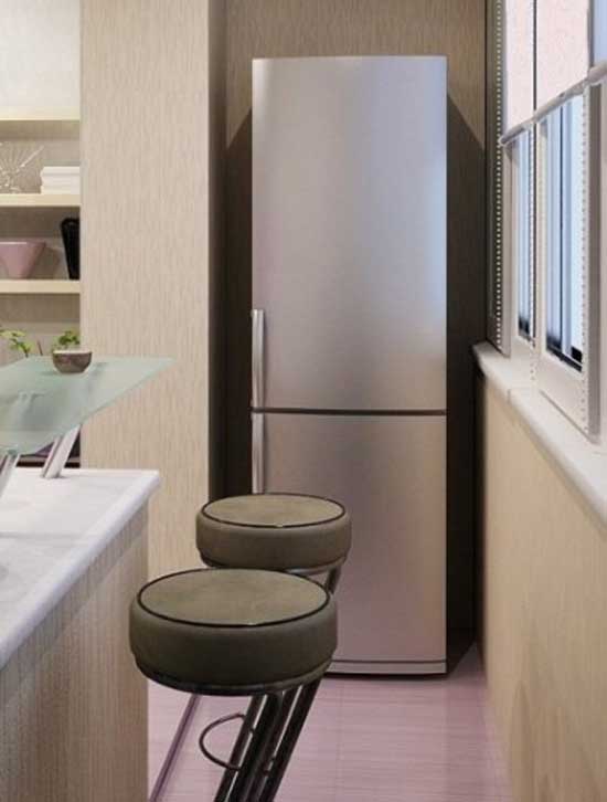 Experten raten dazu, die Nähe des Kühlschranks mit einem Gasherd zu vermeiden, daher sollte er in der Küche liegen. Aber das ist immer noch eine ziemlich bequeme Option, besonders wenn der Balkonraum mit der Küche verbunden ist.