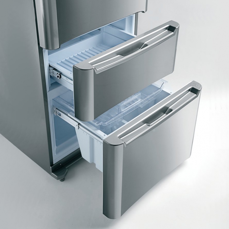 Im Tiefkühlfach gibt es drei Schubladen für Produkte, die vorgesetzt werden können, und einen Behälter Eis-Twister, ausgelegt für Eiswürfel. Der Kühlschrank ist mit einem System ausgestattet "Kein Frost"Das erfordert keine manuelle Wartung und lässt keine Tropfen an den Seiten des Rumpfes herunterlaufen. Der Feuchtigkeitsregler verhindert das Austrocknen von Lebensmitteln.