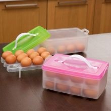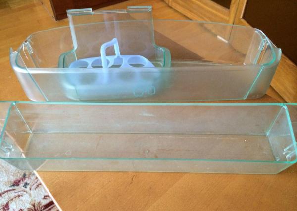 Designer von Kühlgeräten haben spezielle Behälter für Eier in Form von Kunststoffträgern mit Löchern für das Produkt entwickelt. Jedes Haushaltsgerät wird mit den entsprechenden Untersetzern verkauft. Viele Hausfrauen finden diesen Gegenstand nutzlos. In einem solchen Designer gibt es wenige Eier, und der Behälter im Regal nimmt zu viel Platz in Anspruch. Lagern Sie die Eierreste in der Ladenverpackung oder an der Tür des Kühlschranks.