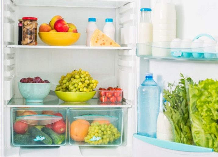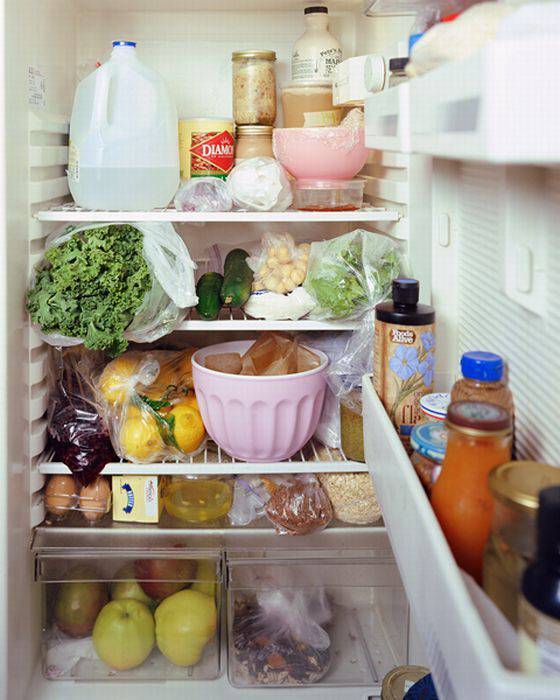 Es ist bequem, Obst und Gemüse in großen Behältern zu lagern. In der kleinen Tür - Cremes, Lippenstifte, Pillen.