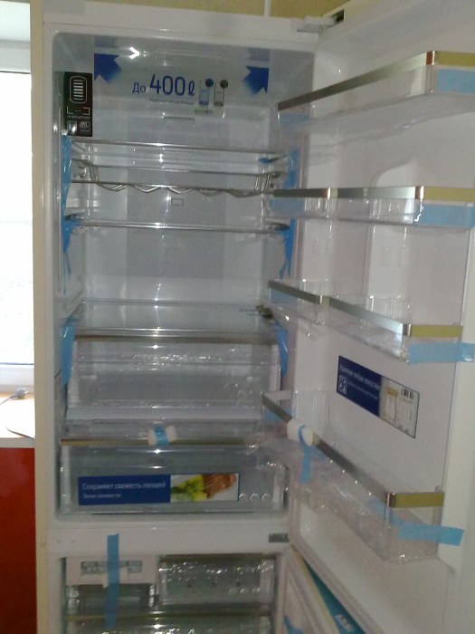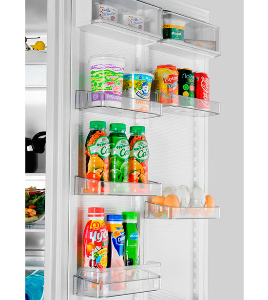 Regale in mehreren Reihen (und sogar ganze Fächer) - bequeme Lagerung von Flaschen im Kühlschrank ist vorgesehen.