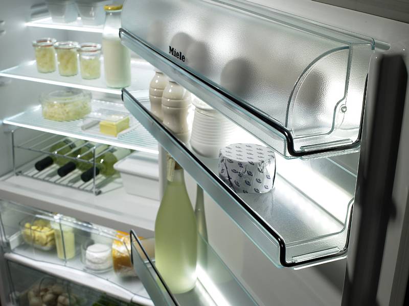 Moderne, teure Kühlschränke mit Glasregalen. Hartglas in der Produktion ist sehr langlebig. Es ist in der Lage, hohen Temperaturen und hohem Gewicht (bis zu 20 kg) zu widerstehen. Kühlschränke mit Glaselementen sind mit einem zusätzlichen Luftzirkulationssystem ausgestattet, das dazu beiträgt, Lebensmittel lange frisch zu halten. Die Vorteile von Glasstrukturen: