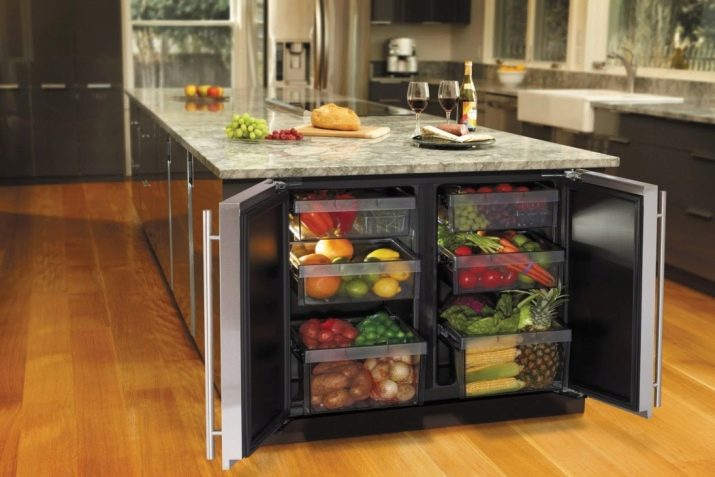 Oft werden Mini-Kühlschränke geschaffen, deren Abmessungen viel kleiner sind als die der gewöhnlichen. Oft sind sie im Wohnzimmer oder in einem speziellen Fach der Küchenzeile installiert. Ihre Breite beträgt in der Regel 45-48 Zentimeter, die Tiefe beträgt bestenfalls 52-56 cm und die Höhe beträgt nicht mehr als einen Meter.