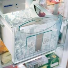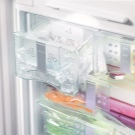 Es gibt Modelle mit eingebauter Bar sowie mit Eiswürfelbereiter. Der Barteil verfügt über eine eigene transparente Tür, ein spezielles Temperaturregime, mit dem Getränke in Flaschen gekühlt, aber nicht gekühlt werden können, sowie spezielle Innenregale mit halbkreisförmigen Öffnungen für Flaschen. Die Eismaschine ist ein kleines Fach im Gefrierschrank, das sich draußen befindet und quasi in den Türkörper eingebaut ist und mehrere Bedientasten hat. Bevor Sie ein solches Modell installieren, sollten Sie ihm Wasser zuführen. Nach dem Anschließen teilt das Gerät in Sekundenschnelle die Anzahl der benötigten Eiswürfel zu.