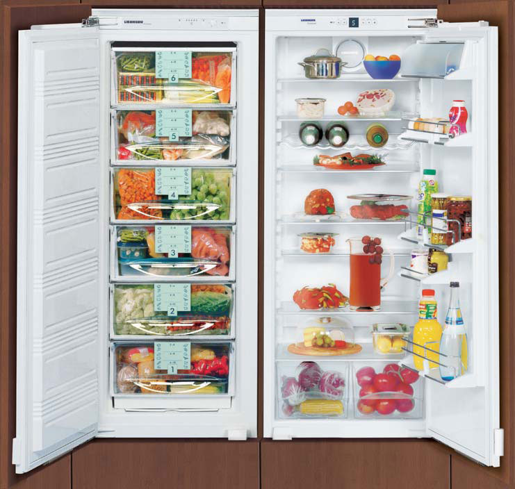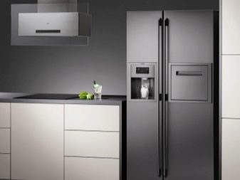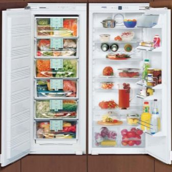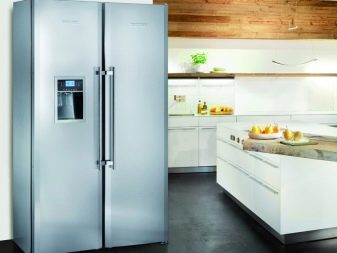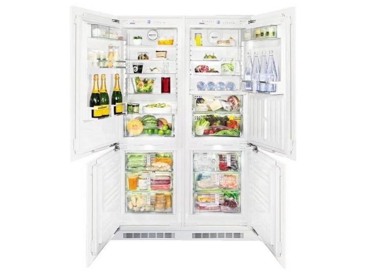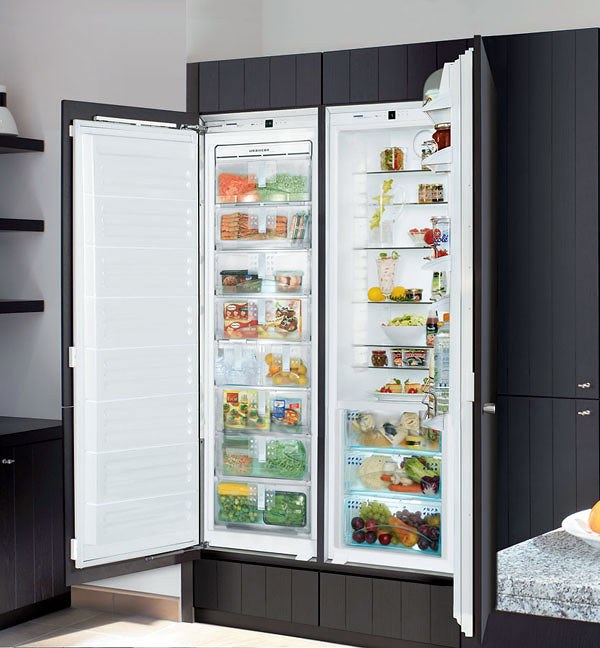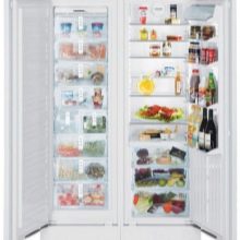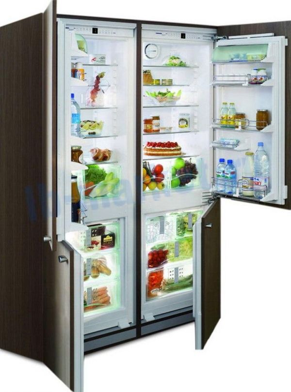Es gibt mehrere Varianten von Kühlschränken. Seite an Seite. Natürlich ist das am weitesten verbreitete Modell breit mit zwei großen vertikalen Fächern, von denen das erste ein Kühlschrank ist, und das zweite ist ein Gefrierschrank. Solche Einbaumodelle haben zwei Pendeltüren, die sich wie ein Schrank in entgegengesetzte Richtungen öffnen.